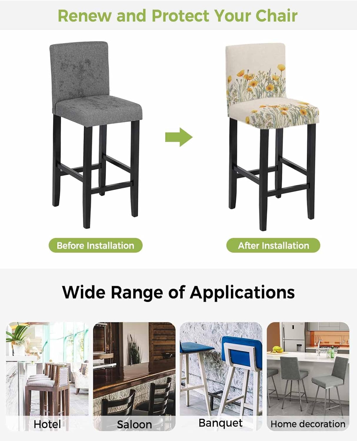 Are you still covering your chair with a throw towel to protect it from children or pets?Are you still worried about the difficulty of cleaning your chair?Do you want To change the look of your bored old chair? Try OComster Waterproof Counter Height Bar Stool Chair Covers. Enjoy a lovely home decor without worries.Applicable Occasions1. Our bar stool slipcovers with backs have perfect stretch, these chair covers fit most short back bar stools, bar stool chairs, counter height stools, can be used in hotel, home bar, kitchen island, restaurant, bar, cafe, counter, celebration and more.2. These waterproof chair covers for bar counter is the perfect Christmas gifts/Thanksgiving gifts/Halloween gifts/birthday gifts/bridesmaid gifts/wedding gifts/anniversary gifts/bridal shower gifts/house warming gifts new home/baby shower gifts and more.3. Our bar stool covers waterproof offer multiple themes and styles with vivid patterns and vibrant colors to choose, simple and stylish, elegant, complement both traditional, country rustic and contemporary styles.How Practical and Durablility is This Chair Cover? - This stretch washable removable bar high chair cover are made of high quality polyester can be washed repeatedly, which is very suitable for daily use. Even after multiple cleanings, our bar stool protector covers still doesn't lose its charm.Measuring Guide & Value Pack- Back Height: 12"-15" (30-38cm)- Seat Length and Width: 14"-17" (35-43cm)- Seat Thickness: 3"-4" (7-10cm)Quantity Selections: There are three quantities to choose from, 2/4/6 in pack.Notes:1. Machine washable, please do not use bleach.2. Manual measurement, please allow slight size differences.3. Due to different screen displays, the colors may be slightly different.