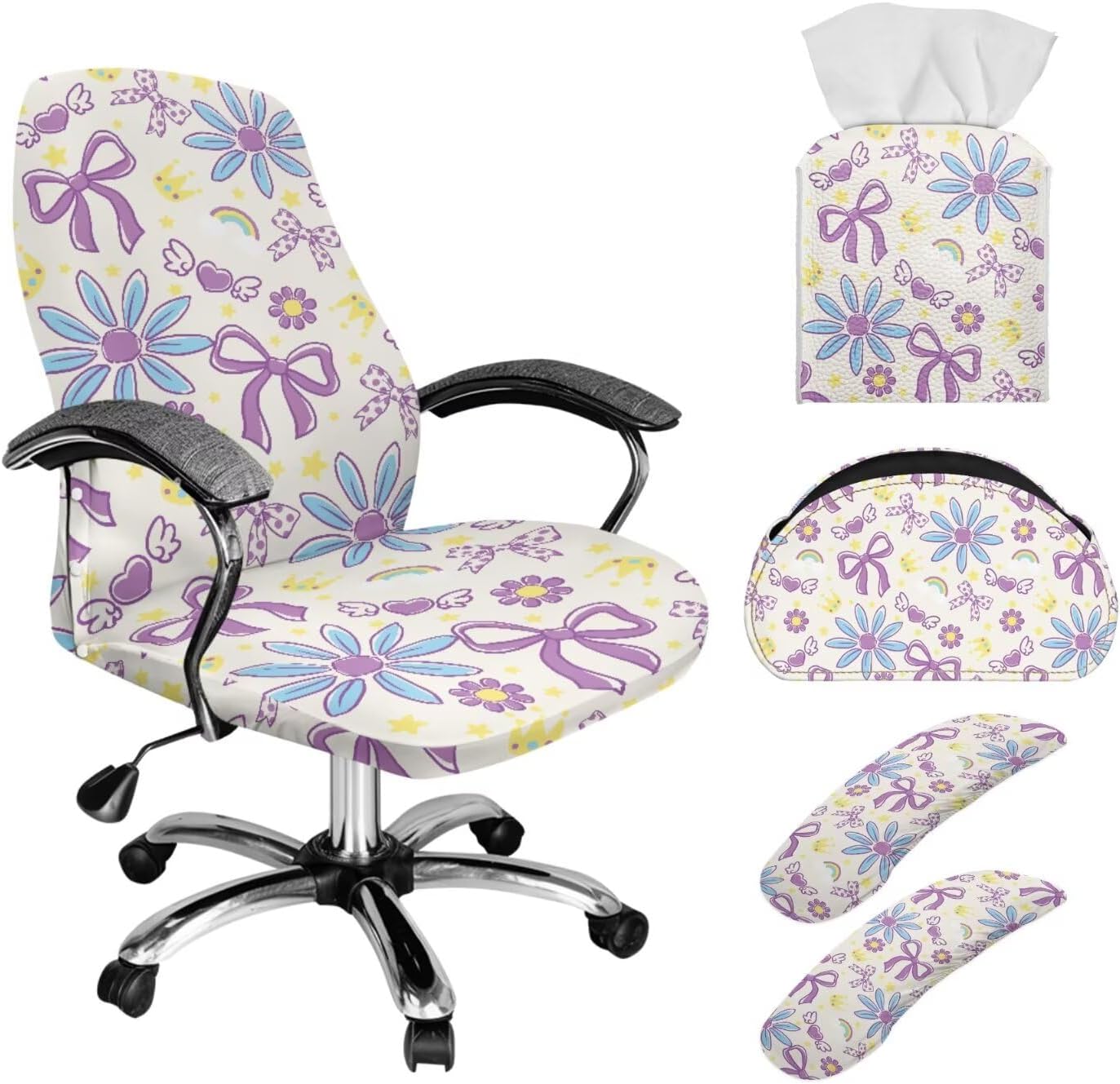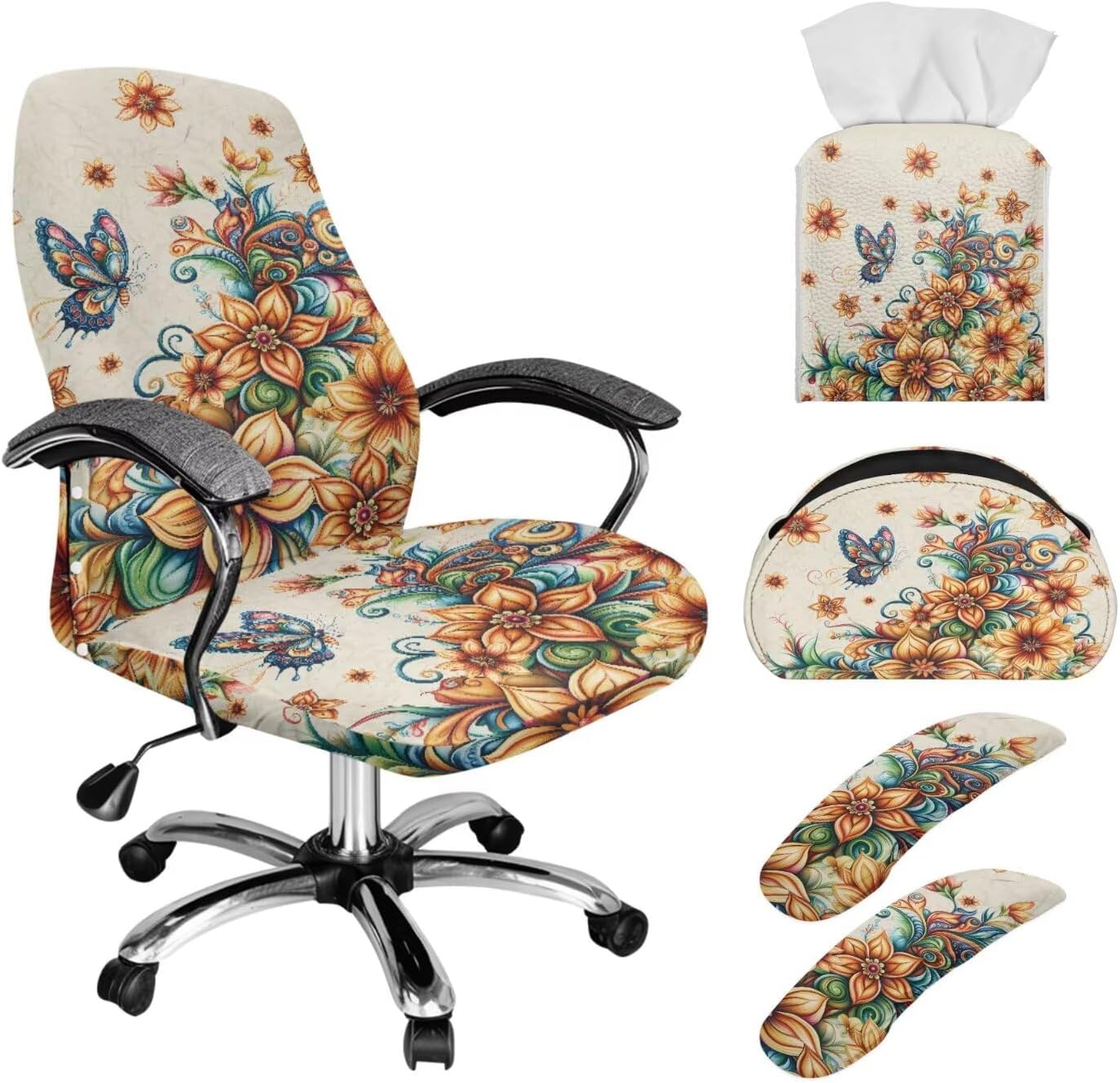 Size of Armchair SlipcoverThe S size fits back width 14.9-21.6 ”, back height 22.8-26.7 ”; seat length 14.9-21.6 ”, seat width 14.9-21.6 ”; The L size fits back width 17.7-22.8 ”, back height 27.5-31.5 ”; seat length 17.7-22.8 ”, seat width 17.7-23.7 ”Upgrade your workspace or home with our all-in-one Office Chair Cover Set, a stylish and practical solution to protect and organize your space! The set includes a stretch-fit chair slipcover, 2 armrest covers, a faux leather tissue box cover, and a multi-compartment remote holder, combining functionality with modern design.Crafted from high-quality polyester, the chair covers resist spills and stains while fitting snugly on most office or desk chairs. The durable faux leather tissue box cover (5.5” x 5.1”) is portable and easy to clean, while the remote organizer (8.46” x 3.15” x 4.8”) keeps clutter at bay with 5 dedicated slots—perfect for remotes, makeup brushes, or stationery.Available in trendy floral, animal, and tribal prints, this set adds a touch of elegance to any room. Whether refreshing your home office or gifting to a loved one, our versatile, easy-to-maintain set is the perfect choice!