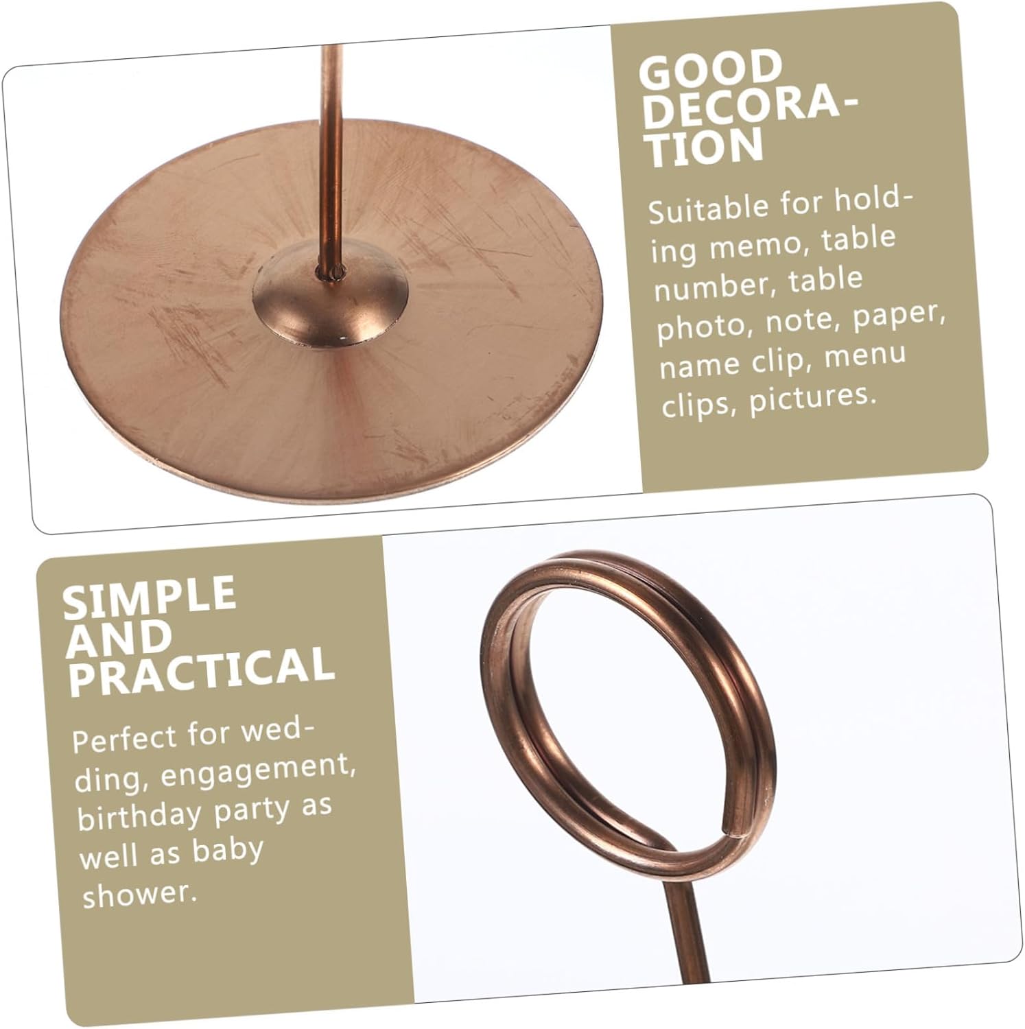 Package List 12 x Table Holder Features - Material: Stainless steel wedding supplies. - Color: Golden. - Size: About 20x7x3.5cm. - Easy to clip and can stand firmly table number holders. - Suitable for holding memo, table number, table photo, note, paper, name clip, menu clips, pictures memo holder. - for wedding, birthday, graduation, shower, engagement party decorations paper clips. - Reusable, accessory to help create a festive environment photo holders - Designed with shape, chic and nice-looking. - Made of material for lasting use.Goods Descriptionphoto holders for wedding, engagement, birthday party as well as shower.table number holders Suitable for holding memo, table number, table photo, note, paper, name clip, menu clips, pictures.memo holder Are you looking for a practical holder? This one will be your choice