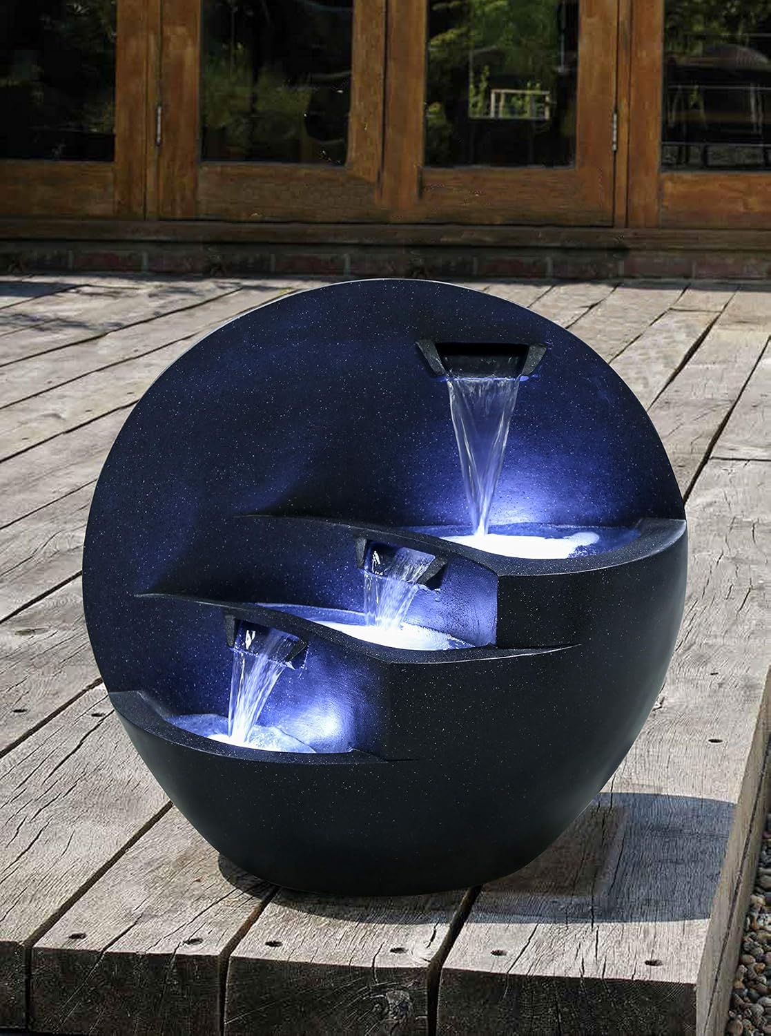 This charming multi-level cascading faountain will enchant your yard or garden and your guests will marvel in its modern beauty. Includes 3 LED Lights
