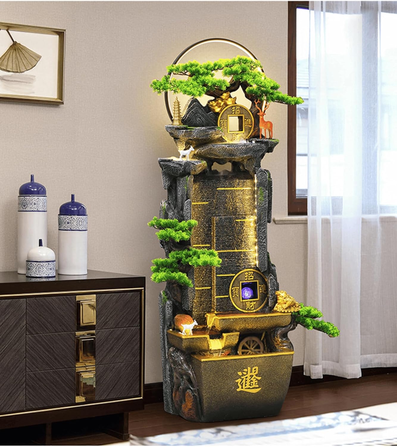 Enhance your living space with this Zen Prosperity Water Fountain, a stunning centerpiece designed to bring peace, prosperity, and a touch of nature into your home or office. Crafted with a Feng Shui-inspired design, this fountain features a beautifully sculpted rockery with cascading water that flows over intricate details, including gold accents and wealth symbols, ensuring that it not only calms the mind but also brings balance and positive energy to your surroundings.