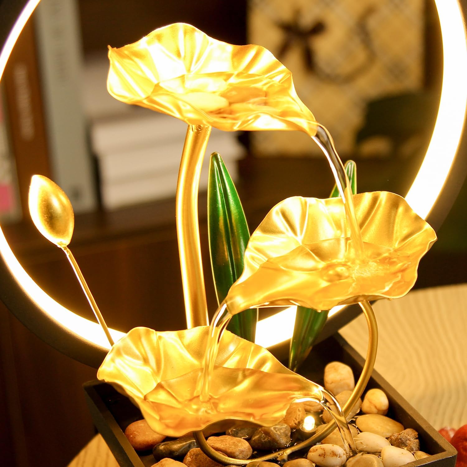 1. Relaxing and Soothing: Enjoy the calming sound of water flowing and a warm light atmosphere with this USB-powered desktop LED water fountain. 2. Perfect for Home and Office: Add a touch of tranquility to your workspace or living space with this tabletop waterfall kit. 3. Zen Meditation: Create a peaceful, serene atmosphere for meditation and mindfulness practices. 4. Natural Rocks: The fountain has natural rocks that add to the aesthetic appeal and create a more authentic experience. 5. Easy to Use: Plug in the USB cable and enjoy the benefits of this indoor LED water fountain.