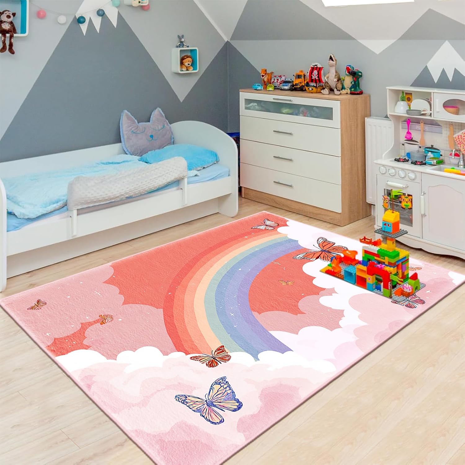 ZOCOZY Cartoon Sky Area Rug - Create a Magical & Safe Play Area! Enchanting Design Transform your child's room with our beautiful cartoon sky theme. The playful pattern of smiling suns, fluffy clouds, and twinkling stars sparks imagination and creates a joyful atmosphere for kids. Superior Safety & Comfort The non-slip rubber backing keeps the rug firmly in place on hard floors, preventing slips and falls. Made from ultra-soft, skin-friendly plush, it provides a comfortable and warm surface for playing, crawling, or napping. Easy Care & Versatile Use This durable rug resists daily wear and is easy to clean—just vacuum or spot clean. The versatile 7x5 ft size and charming blue design make it perfect for nurseries, kids' bedrooms, playrooms, and even living areas. Order now to add a touch of magic and safety to your home!