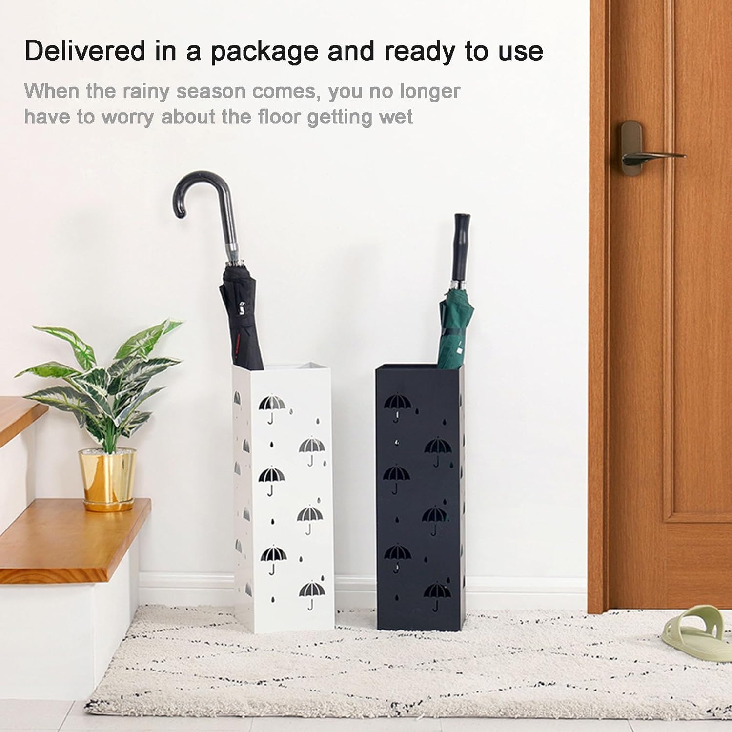 Enhance your entryway with our stylish square metal umbrella stand, designed for both functionality and aesthetic appeal. This spacious umbrella holder features an intricate cut-out umbrella pattern that adds a unique artistic touch to any environment. Crafted from durable metal, it is built to withstand daily use while maintaining its sleek appearance.The open square design allows for easy storage and quick access to your umbrellas, while the hollow structure promotes airflow, helping wet umbrellas dry efficiently. Its compact and space-saving design makes it an ideal choice for homes, offices, or even outdoor patios.Product Name: Metal Umbrella StandMaterial: MetalColor Options: Black, Gold, WhiteDimensions: 15*15*50 cm/5.9*5.9*19.7 inchesStyle: Simple and ModernPlease note that the dimensions are measured manually, and there may be slight variations. Color differences may occur due to different resolutions and monitors. If you encounter any issues upon receiving your package, please contact us for assistance.