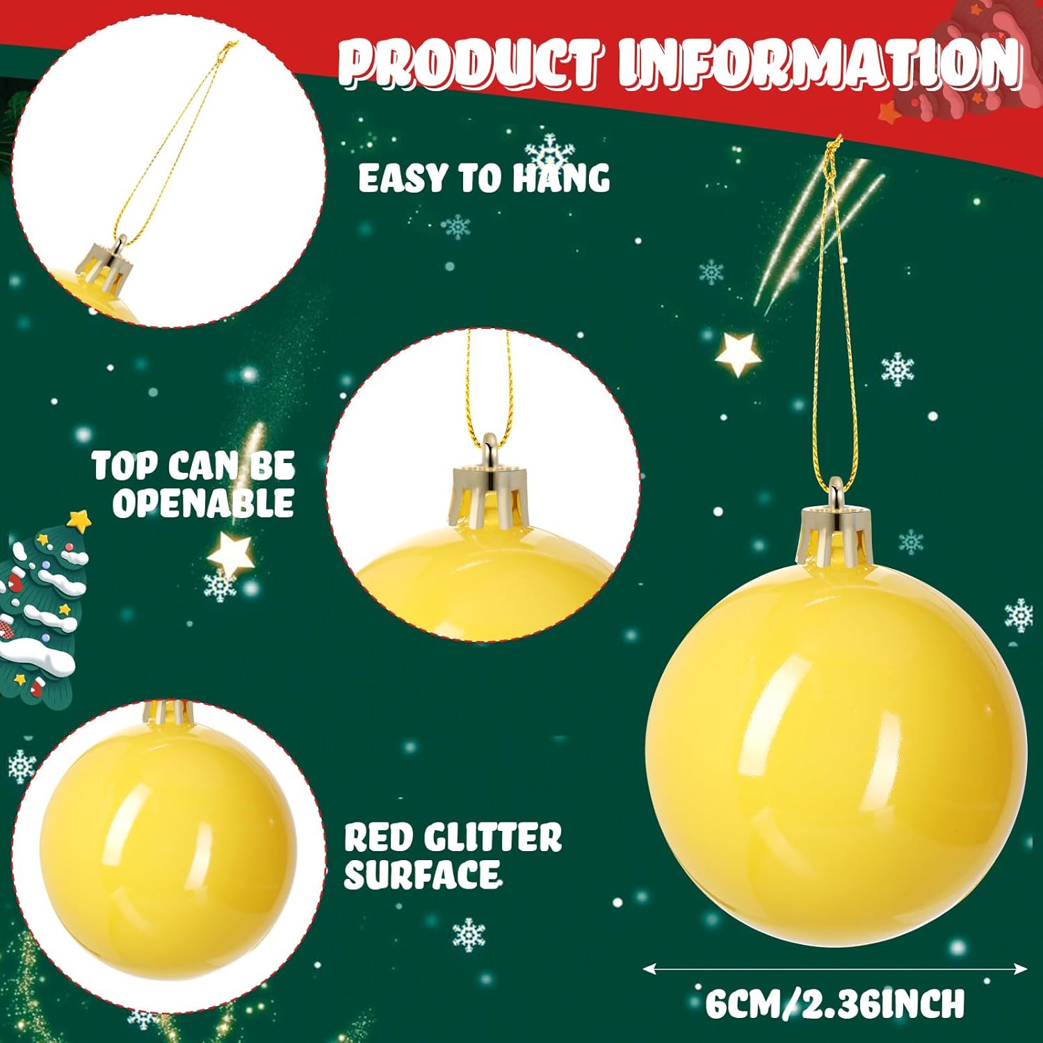 Product Information: Easy matching: Each Christmas ornaments balls comes with a hook for easy access and hanging the places you want to decorate, suitable for decorating various indoor and outdoor events. Featuring glittering and shiny surface, Christmas tree ball pendant are eye catching at the party under the light, which will adding more exquisite sense to your Christmas decoration Specifications: Material: PVC Color: yellow Length: approx.60 mm/ 2.4 inches in diameter Package includes: 24 x Christmas decorative balls Note: Manual measurement, please allow slight errors on size. The colors may exist slight difference due to different screens.