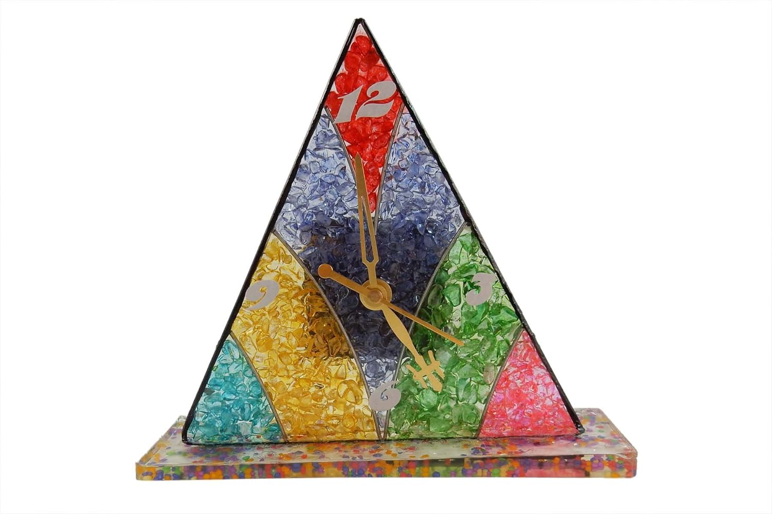 Colorful Triangle Mantle Clock with Gold Tone Hands and Beverly Oaks Certificate of Authenticity. Colorful Stones inlaid into Resin Triangle set on a Resin Base filled with Scattered Colorful Flecks. Retro feel to this Hand-made, One of A Kind Design.