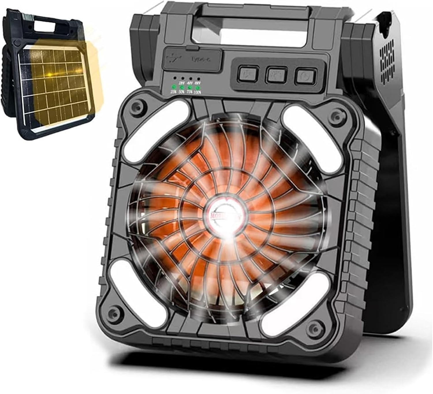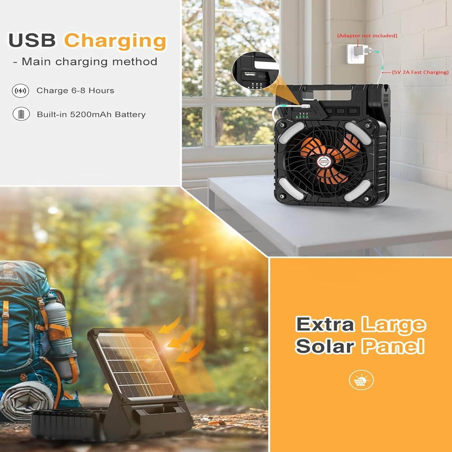 Desktop Fan with Light Rechargable Camping Fan Multifunctional Solar Cooling Fan Suitable for Outdoor Hiking Event outdoor fanFeatures: Staying cool and comfortable with our camping fan. Perfect for outdoor useing, it provide a refreshing breezeing.Our camping fan is suitable for convenience and versatilitys. It offer customizable airflows to suit your preferencees.Whether you enjoy camping, fishing, spending time outdoors, our camping fan is perfect. It ensures you stay comfortable during your outdoor activity.Take our camping fan with you on your next adventure. Its lightweight designs makings it easy to carry and set up in any location.Experience the convenience of our camping fan. With its powerful wind speed and long battery, it provide a refreshing breezeing whenever you require it.Specifications: Material: ABSVoltage: 5VCurrent: 2ABattery Capacity: 5200mAhNoise: 37-45dBSpeed: 2800RPMWind Speed: 4.50M/SecondSize:Approx. 6.9x3x9.10inch(17.5x7.5x23cm)Package Includes: 1x Camping FanNote: Please allow 1-2cm errors due to manual measurement. Please make sure you donot mind before order.Due to the differences between different monitors, the picture may not reflect the actual color from the item.