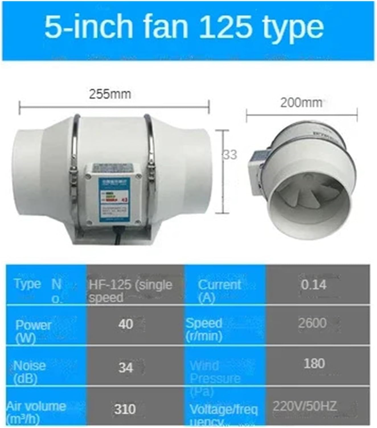 Exhaust Fansscope3 inchesPower: 35WSpeed: 2600r/minAir volume: 120m3/hAir outlet size: 70mm4 inchesPower: 35WSpeed: 2600r/minAir volume: 200m3/hAir outlet size: 95mm5 inchesPower: 40WSpeed: 2600r/minAir volume: 310m3/hAir outlet size: 122mm6 inchesPower: 75WSpeed: 2600r/minAir volume: 540m3/hAir outlet size: 147mm