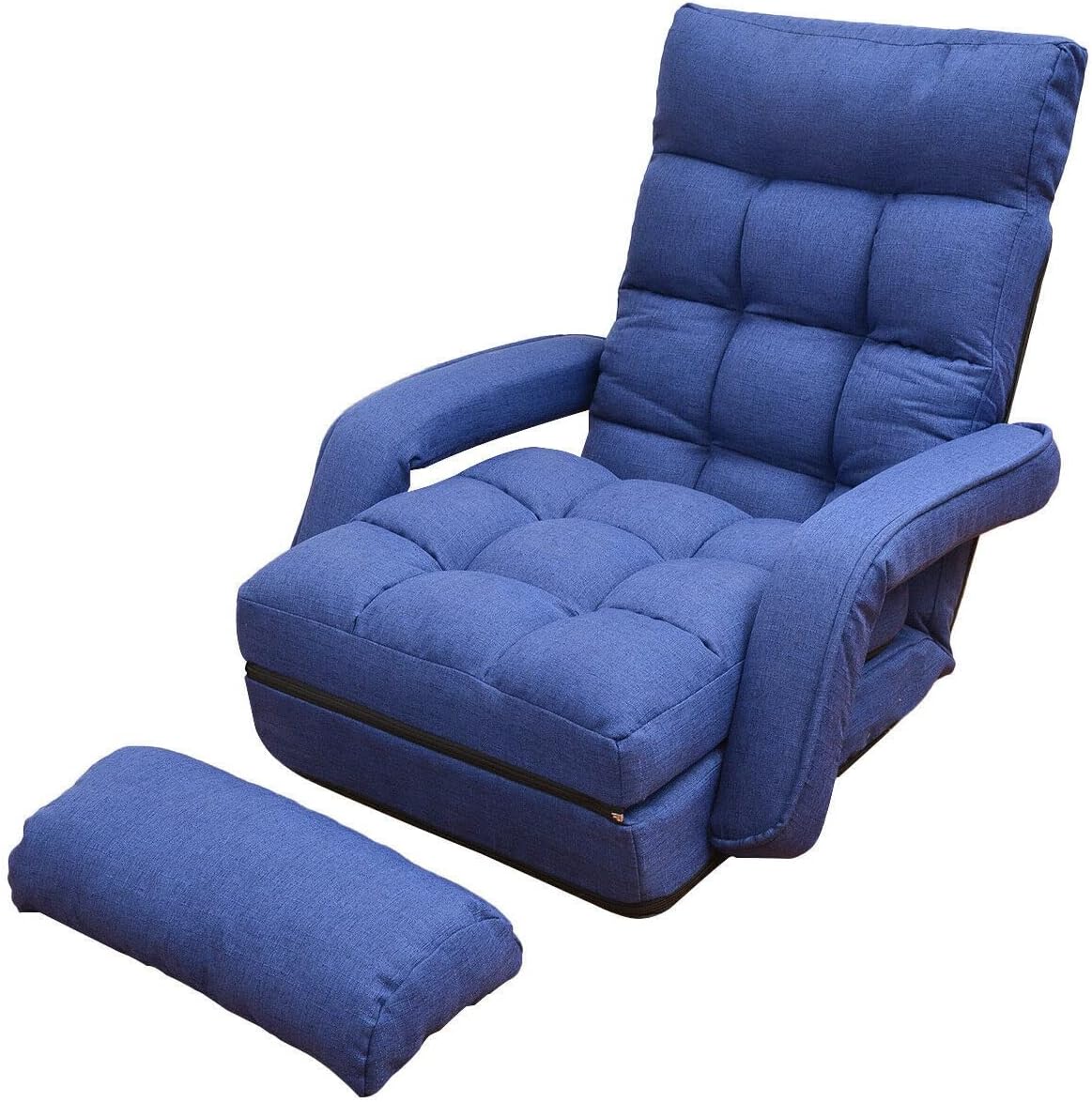 Color: Blue Material: Fabric + Recycled Cotton + Metal Frame Flat Dimension: 66in (L) x 20 in (W) 90°Folded Dimension: 19 in (L) x 28 in (W) x 28 in (H) Adjustable Angle: 90°-180° Net Weight: 18 lb Shipping Weight: 19.6 lb Package size: 27 x 24 x 15 in Package content: 1 x Floor Chair Sofa 1 x Pillow