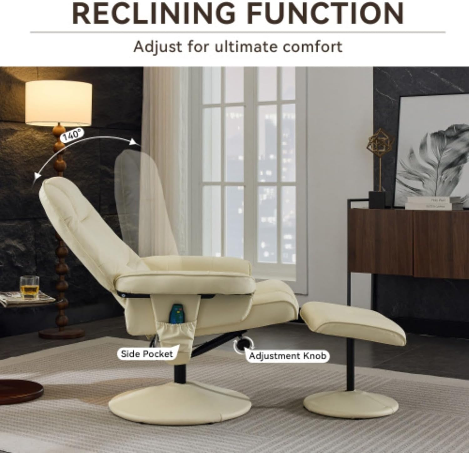 Product Information Product Type: Single Box Product Product Name: Massage Recliner with Footrest Origin: China Main Color: Beige Main Material: Can Padding: Foam Product Style: Modern Product Dimensions Assembled Length (inches): 31.30 Assembled Width (inches): 29.53 Assembled Height (inches): 42.13 Product Weight (pounds): 39.60 This recliner with footrest is equipped with a remote control massage system for enhanced comfort. It offers 3 massage positions for back, waist and thighs, 5 vibration massage modes, and comes with timer settings and seat heating. The massage intensity can be adjusted from weak to strong by adjusting the massage mode and massage points.