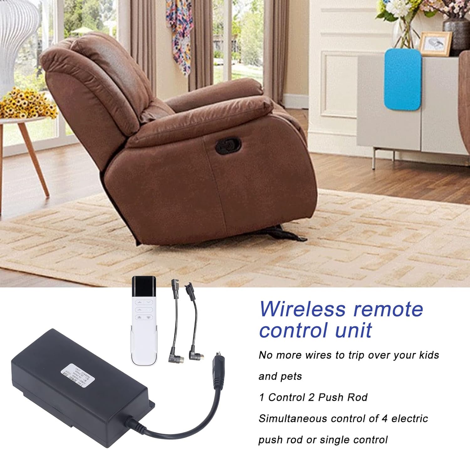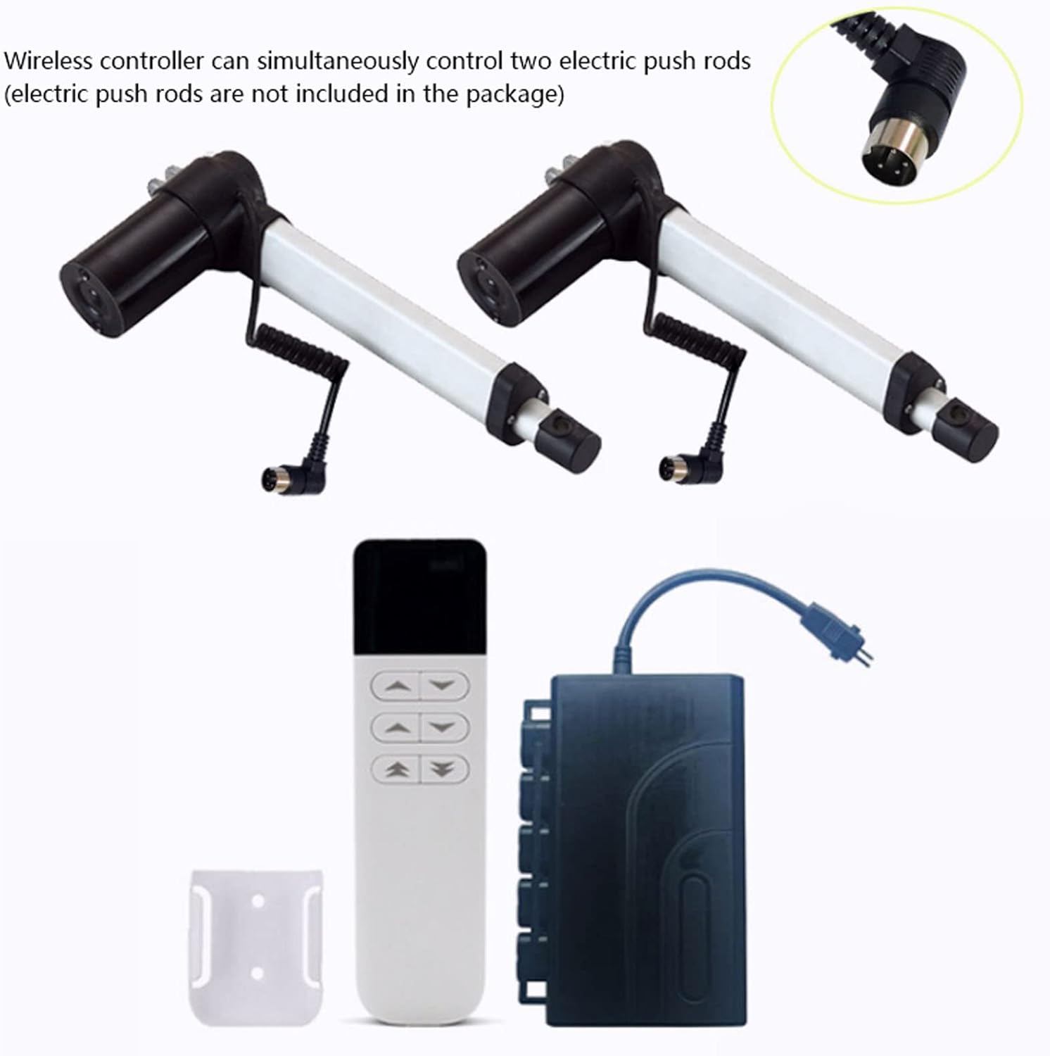 Recliner Wireless Controller, Electric Recliner Controller, Recliner Wireless Controller 2.4G Single Motor Wireless Remote Control 1 for 2 Motor DC29V Electric Recliner ControllerSpecification:Item Type: Recliner Wireless ControllerMaterial: ABS Motor Wireless Control (All In One)RF Frequency: 2.4GHzWireless Distance: Approx. 10-30m / 32.8-98.4ftCode Pairing Mode: Power On The CodeRemote Control Power: 2 x AAA Batteries (Not Included)Input Voltage: DC29VOutput Power: DC 29V/2A (Instantly Up To 7.5A)Standby Power Consumption: <1W (With Wireless Receiver Board)Protection: Over Current Protection, Short Circuit Protection, Overheating ProtectionAdapter Interface: 1 5P Female, 2 4P FemaleGross Weight: 340g/12.0ozPackage List:1 x Controller 1 x Remote Control(Batteries Are Not Included)2 x Adapter Cable