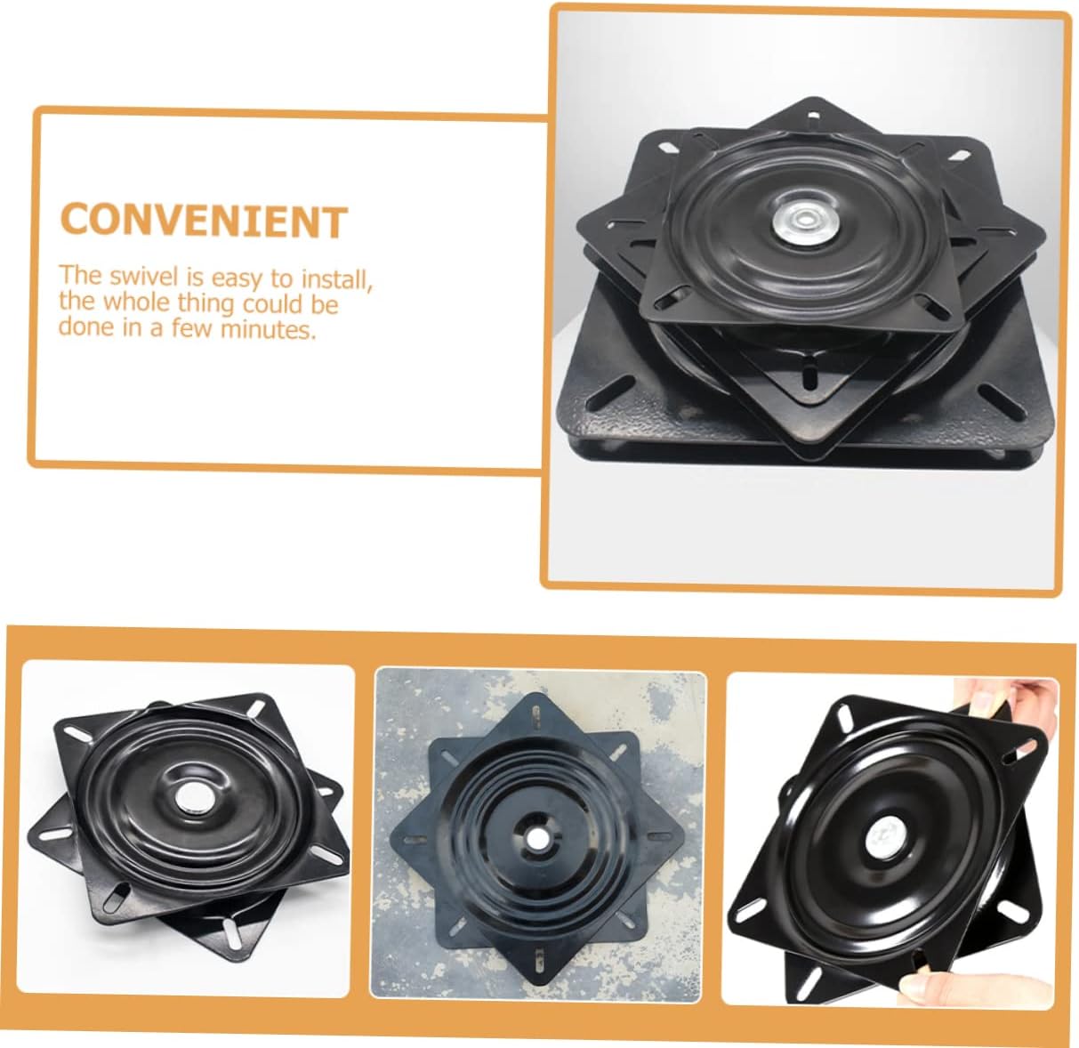 Package Include 1 x Swivel Features -Color:Black swivel plate for furniture -Size:19.40X19.40X2.00cm/7.62X7.62X0.79in swivel base for chair -Material:Steel seat swivel - 360 degree rotation, firm bearing design, your furniture can swivel smoothly rotating swivel - A good substitute boat seat swivel for your broken or worn out one furniture swivel mechanism. - Chic in look, simple and practical in use, give you a pleasant using experience boat seat swivel base. - This swivel plate is fit for bar chairs, sofas, display cabinets, table furniture rotation swivel mechanism for furniture. - Made with high grade steel material, and sturdy for lasting use office chair replacement parts.Goods Descriptionheavy duty steel turning plates Free rotation 360°.swivel mechanism for recliner chair Features the steel material, which has high durability, not easy to deform.recliner chair swivel mechanism Fine workmanship, ensures practicality.swivel plate for recliner chair It has good bearing capacity and stability.rotating swivel plate This boat seat swivel is made of , which can withstand use.seat swivel Achieve quiet, smooth rotation