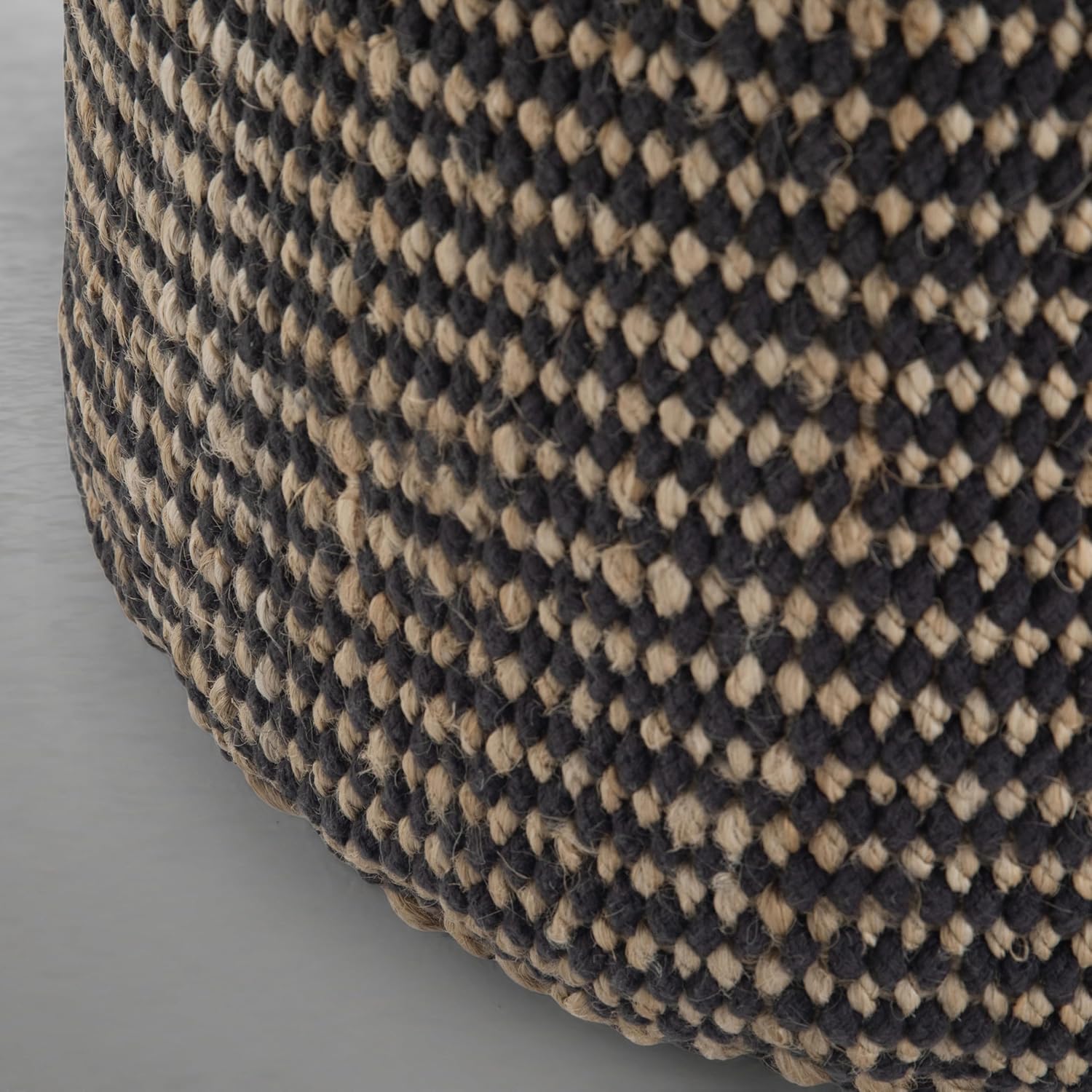 Add natural texture and casual sophistication to your space with the Larissa Boho Round Braided Pouf. Measuring 18 inches wide and 14 inches tall, this handcrafted pouf is made from enhanced sandy natural and ebony hand-braided jute, offering improved durability and a smoother, more refined finish. The tightly woven jute fibers bring earthy warmth and tactile depth to modern, coastal, or bohemian spaces. Filled with dense polystyrene beads for structure and support, the Larissa Pouf works perfectly as a footrest, casual seat, or decorative accent. Fully assembled and easy to move, it blends artisan craftsmanship, versatile function, and sustainably improved materials to create a stylish and practical addition to any room. This product is now packed responsibly in plastic-free honeycomb cardboard to reduce waste and support sustainable recycling.