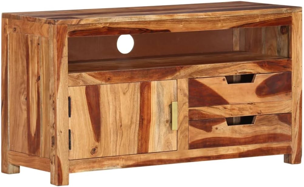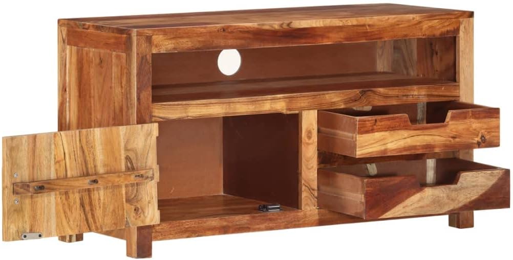 This stylish wooden TV cabinet with a unique design will make a timeless addition to your living room or entertainment area. It can be used as a TV stand, hifi cabinet, or lowboard.Premium material: Solid acacia wood is a beautiful natural material. Treat the surface with oil, wax, lacquer, or a glazing finish for a stronger surface and easy cleaning. Acacia wood is a tropical hardwood, which is dense, sturdy, and durable.Decorating function: The beautiful wood grains make each of our TV cabinets unique and slightly different from the others. Storing function: This TV stand with 1 door, 1 shelf and 2 drawers provides ample space for keeping your DVD player, game console, streaming device, media carriers, etc. neatly organized.Material: Solid acacia wood with a honey finishDimensions: 35.4" x 13.6" x 19.7" (W x D x H)With 1 door, 1 shelf and 2 drawersPolished, painted, and varnishedAssembly required: Yes