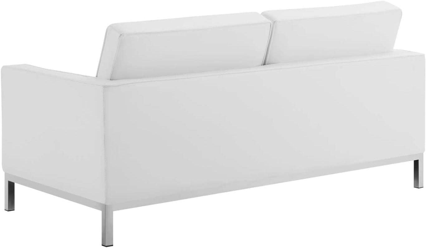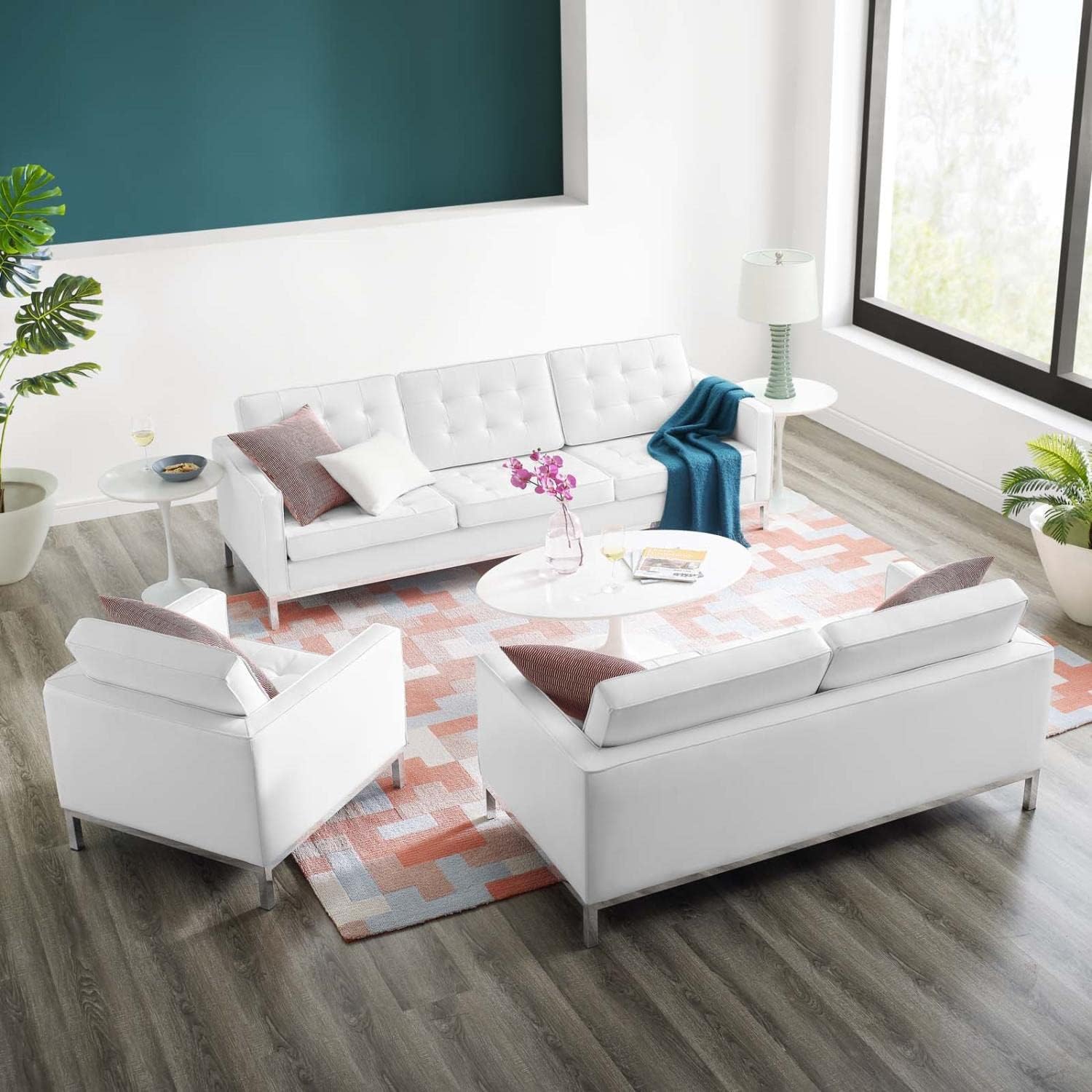 Revolutionize your living room furniture with the iconic Loft Tufted Faux Leather Accent 3 Piece Set which includes Sofa, Loveseat, and Armchair. Adding visual depth to your living room or lounge space, Loft features soft and durable faux leather upholstery accented in elegant button tufting. This modern living room set comes in a captivating linear design with an external tubular stainless steel frame, four stainless steel silver legs, and non-marking foot caps. Inspired by the richness of mid-century modern style, Loft is the preferred choice of living rooms and lounge spaces.Features:- Set includes: 1 sofa, 1 loveseat, 1 armchair- Material: Faux leather, stainless steel- Finish: Silver, white- Mid-century living room 3 piece set- Smooth faux leather upholstery- Linear biscuit button tufting- Dense foam padded cushion- Non-marking foot capsSpecifications:- Product Dimensions: 31"H x 95"W x 155"D- Product Weight: 235 lbs- Product Dimensions: (Sofa) 32"L x 91"W x 31"H- Loveseat Dimensions: 32"L x 63"W x 31"H- Armchair Dimensions: 32"L x 30.5"W x 31"H- Weight Capacity: (Sofa) 900 lbs- Weight Capacity: (Loveseat) 600 lbs- Weight Capacity: (Armchair) 300 lbs