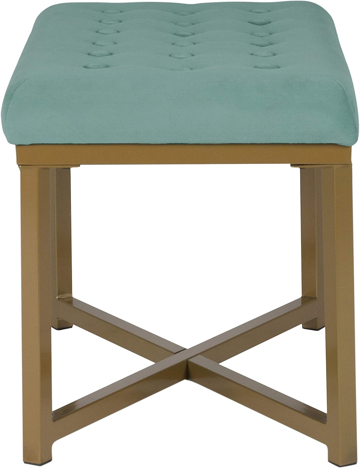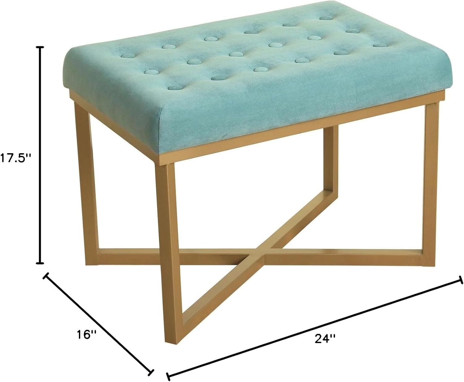 Embrace modern luxury with this metal bench velvet seat. This soft tufted velvet ottoman in an elegant light teal color over a gold-finished metal base performs multiple functions in any home. Use this velvet ottoman to prop up feet in a family room, to display favorite books in a living room, or to seat an extra guest in the dining room. Multiply the impact by pairing two together at the end of a bed or in front of a favorite place to lounge. Available in a variety of colors, this metal bench is easy to assemble and maintain.Please note that fabric and wood colors may appear slightly different due to variations in lighting or screen settings.