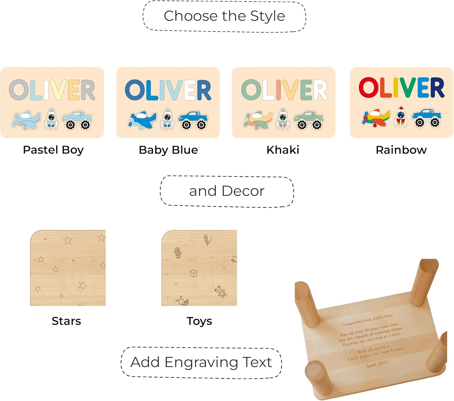 | Other Special Features of the Product | Personalized Name, Solid Wood, Smooth Finish, Lightweight, Easy to Carry, Fun Designs, For Toddlers, Handmade |