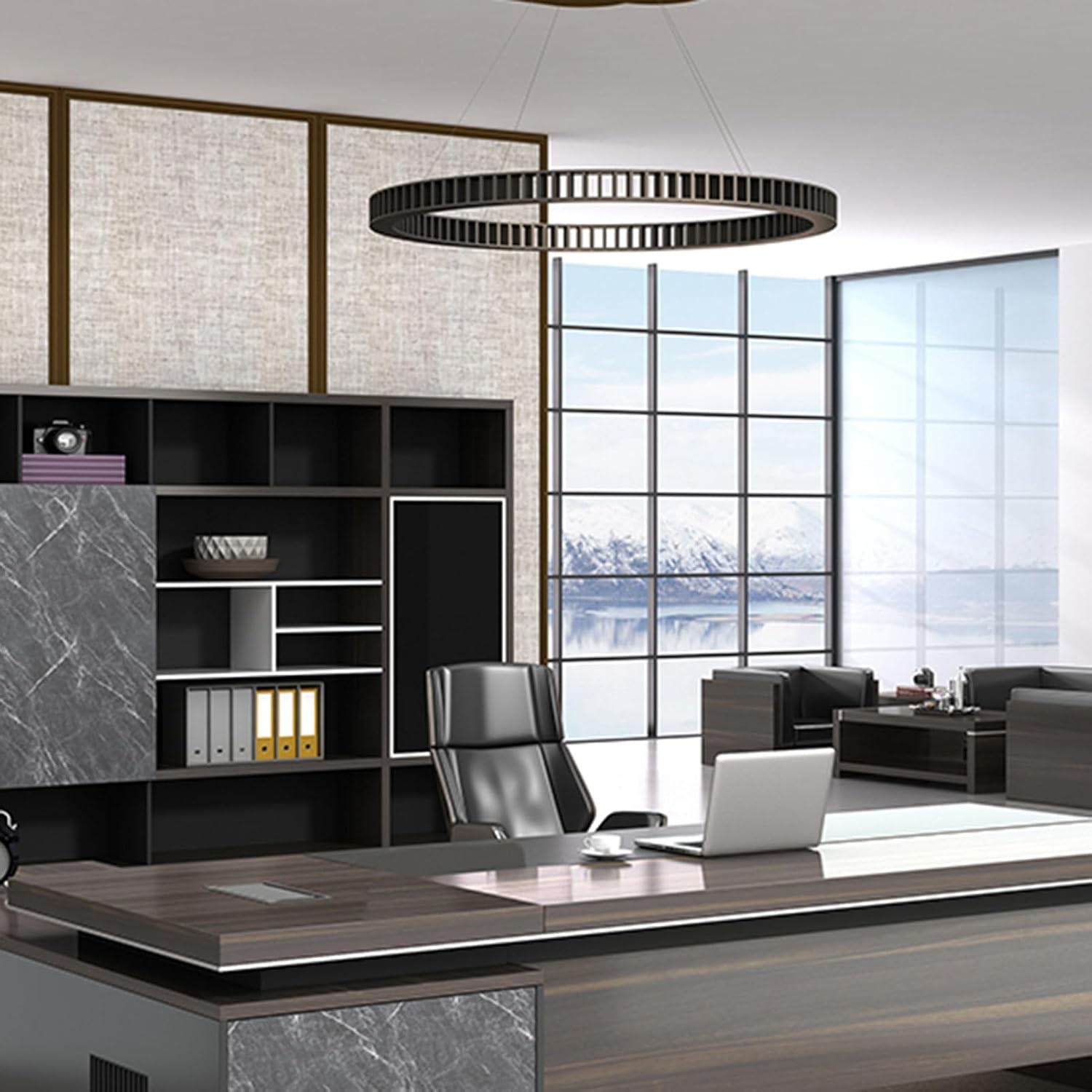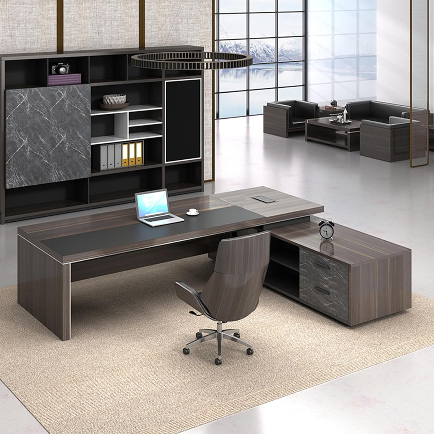 Product Dimensions: 94"L x 63" W x 29.5"HColor: BrownStyle: ModernBase Material: Wooden LegsTop Material Type: WoodFinish Type: WoodSpecial Feature: L-ShapedRoom Type: Office, Bedroom, Study RoomRecommended Uses for Product: WorkingPackage List:Executive Desk x1Installation Accessories x1
