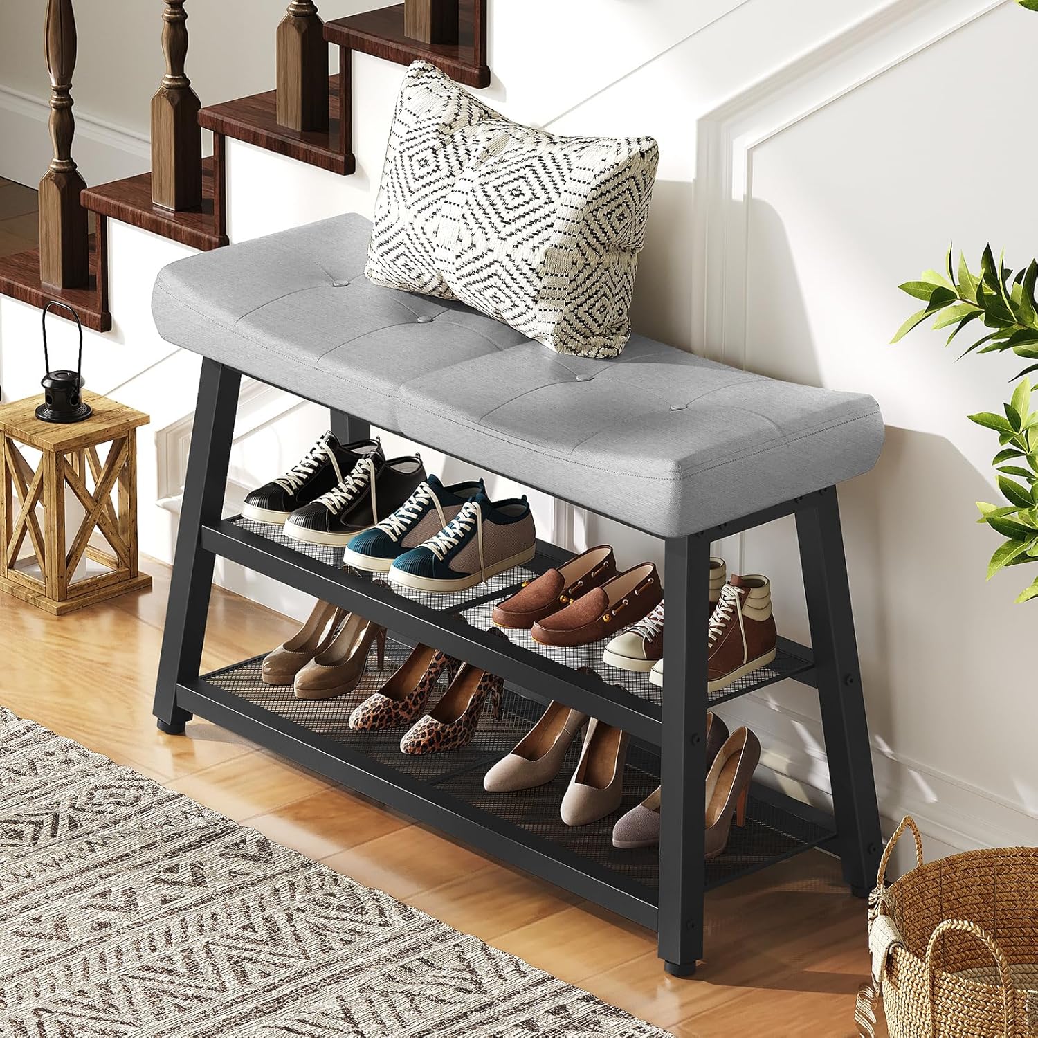 YATINEY Coat Rack Shoe Bench, 4-in-1 Hall Tree with Storage Shelves and Hanging Rod, Entryway Storage Organizer with 8 Movable Hooks, Shoe Bench, 3-Tier Shoe Rack, Entryway Bench with Storage and Cushion, for Hallway, Foyer, Bedroom, MT12BR-HX02BG