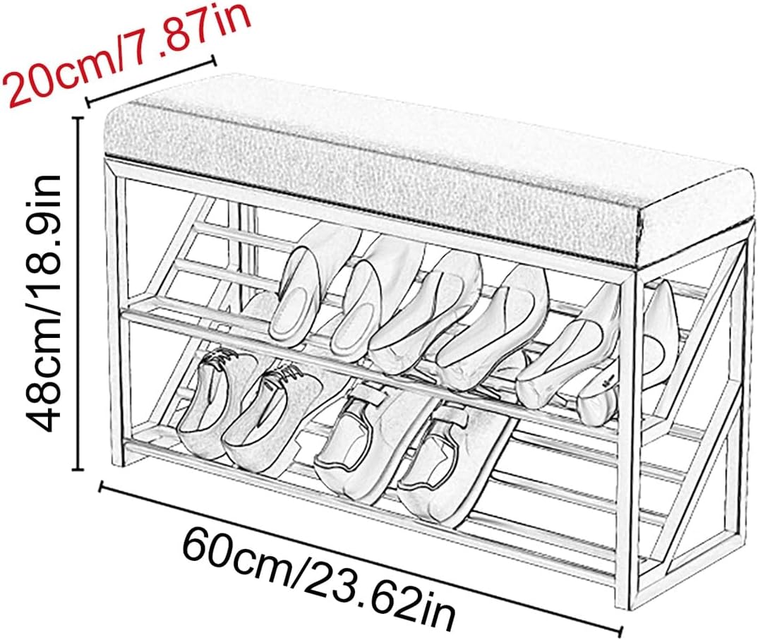 2-Layer Shoe Changing Bench Metal Shoe Storage Rack Upholstered Shoe Rack BenchWith two open shelves, this metal shoe storage rack provides ample space for 6-8 pairs of shoes, keeping them neatly arranged and easily accessible. The open design allows for quick grab-and-go convenience, making it ideal for frequently worn footwear like sneakers, sandals, or slippers. No more bending or wobbling – the padded top offers the perfect spot to sit while tying your laces or slipping off your boots. Beneath the bench, two sturdy metal layers provide ample space to store up to six pairs of shoes, keeping your floors clutter-free and your hallway looking clean and tidy.More than just a shoe rack, this shoe changing bench features a soft, padded seat for effortless shoe changes. The plush upholstery ensures comfort while you put on or take off shoes, eliminating the need to bend down awkwardly. Built with a strong metal frame, this shoe rack bench is designed to support up to 220 lbs, making it sturdy enough for daily use. The anti-rust coating ensures practicality, while the non-slip rubber feet protect your floors from scratches.This easy-to-install shoe storage rack comes with all necessary hardware and clear instructions, so you can assemble it in minutes without frustration.Notice:Children are not allowed to climb on or play with the storage chest for safety reasons.Assemble this product on a soft surface to prevent scratches.Solve the label removal method: You can use a hair dryer to heat the label.When a certain heat is reached, the label is easy to tear off.Due to manual measurement, please allow for a size deviation of 1-2 centimeters. Please refer to the actual product received for accurate dimensions.