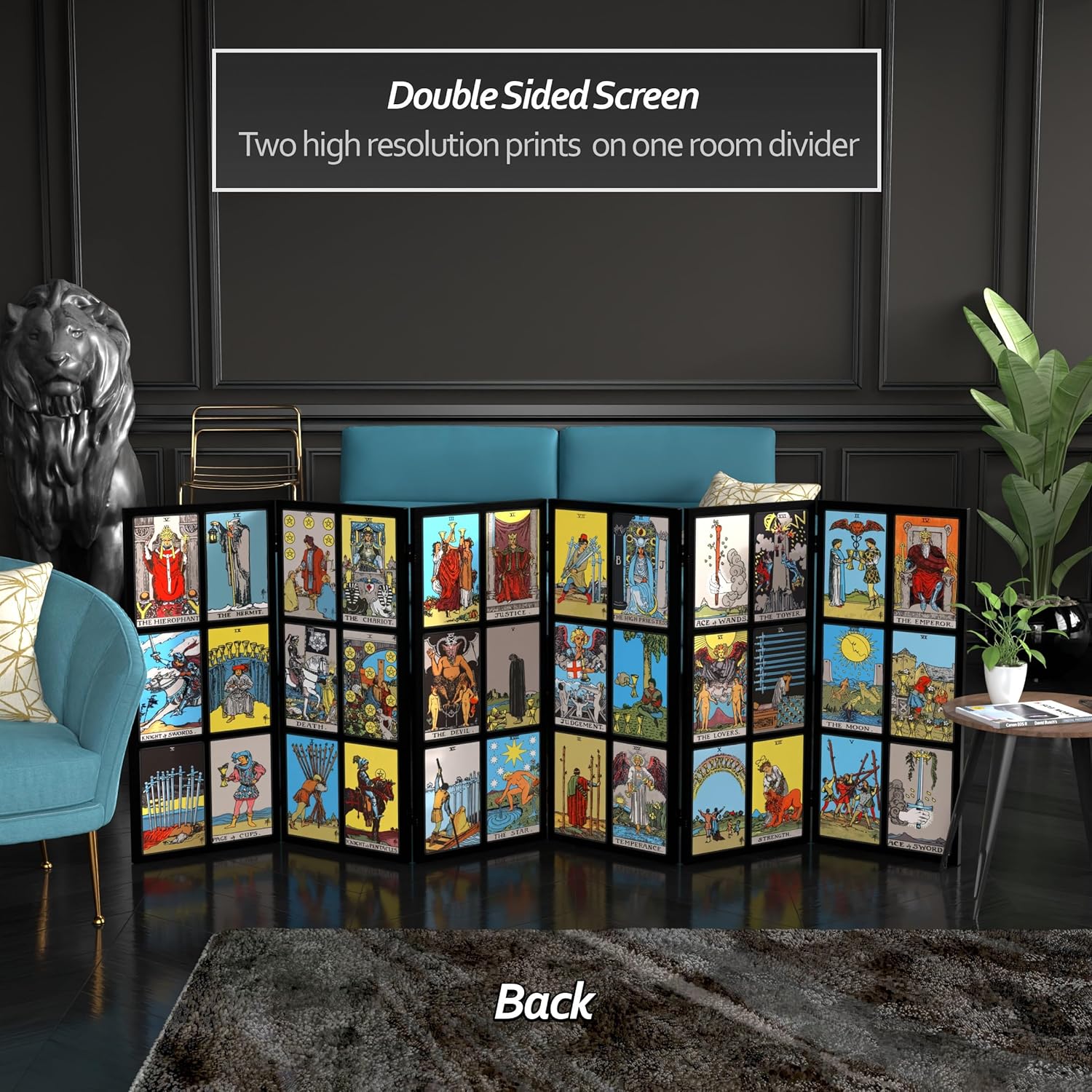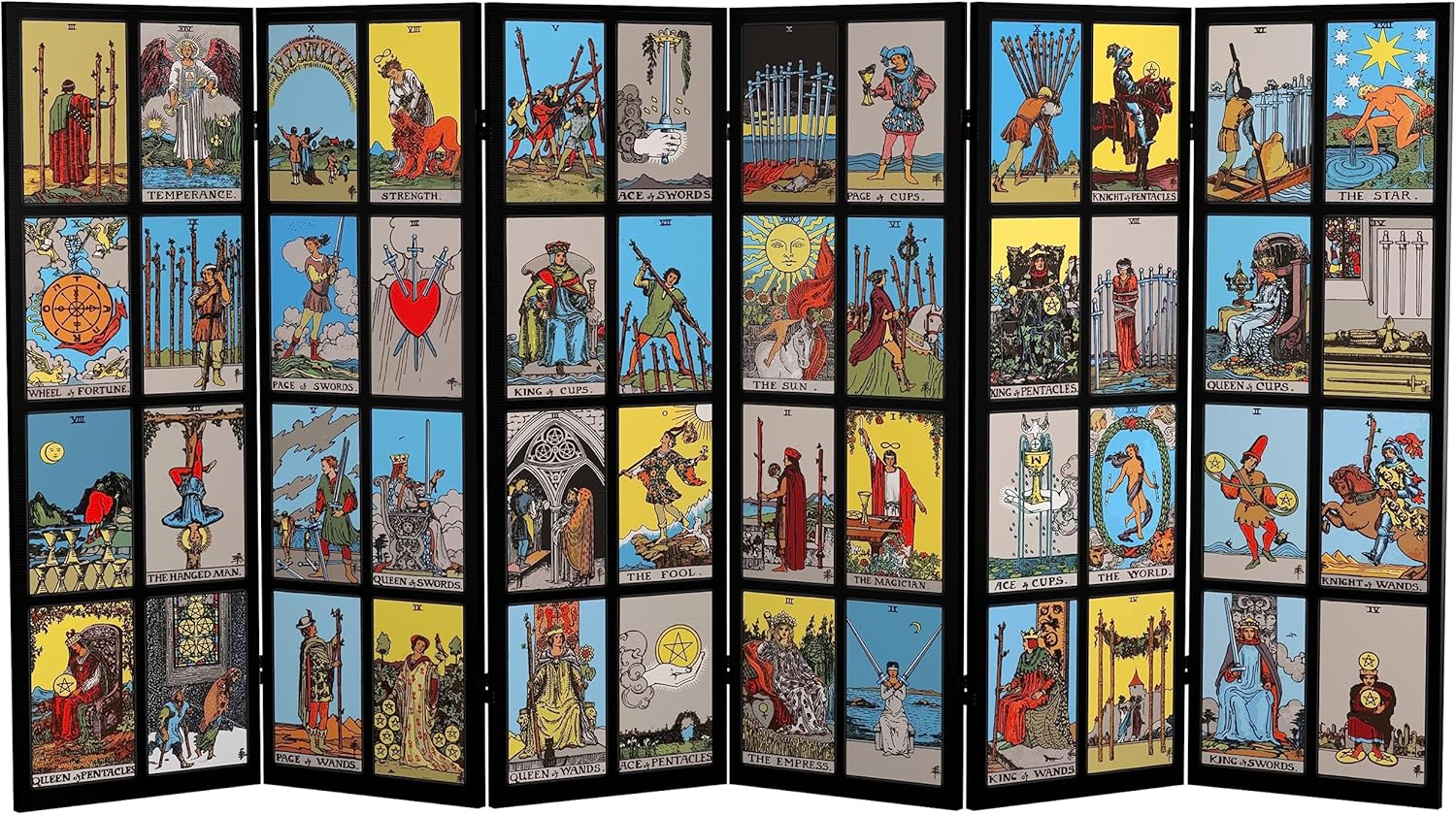 Unlock the mysteries of the universe with our 3 ft. Short Double Sided Rider-Waite Tarot Canvas Folding Screen. Crafted with premium canvas, this folding screen features captivating artwork of the iconic Rider-Waite Tarot deck on both sides. Each card represents a unique aspect of life and spirituality, adding intrigue and symbolism to your space. With its convenient smaller size and folding mechanism, it easily becomes a captivating focal point or divination tool for any space!