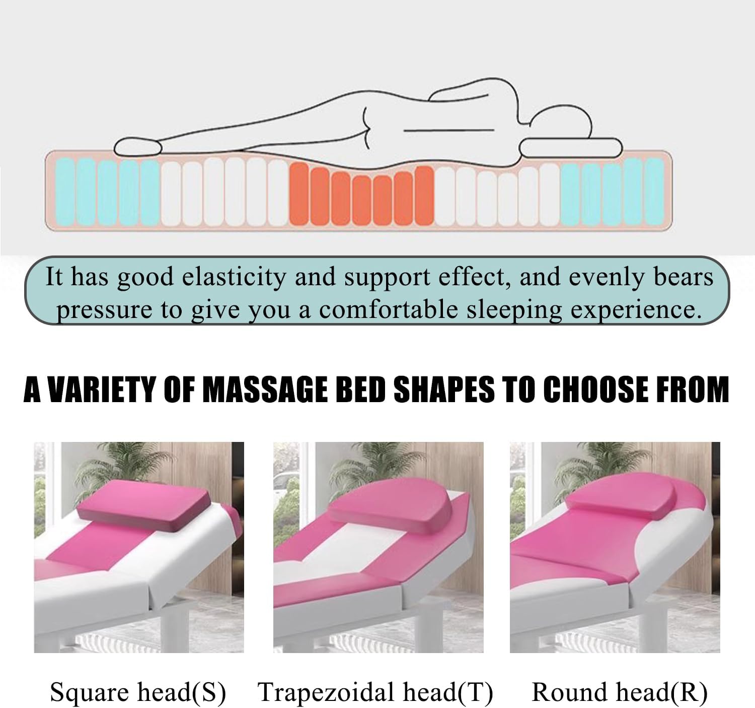 Thick and comfortable mattress topper for beauty salonsHigh resilience memory foam + latex combination fillingNot easy to collapseEvenly supports the guest's bodyGive your guests the most comfortable massage experienceFabric: Knitted fabricFilling: latex+memory foamThickness: 6cm(2.4in)With or without facial breathing holes: with holeMassage mattress shape: (S)Square Head, (R)Round Head, (T)Trapezoidal HeadSeason of use: all seasonsUse places: beauty salon, health center, chiropractic, spa sauna, physiotherapy massage parlor, etcColor:white,gray/A,gray/B,gray/C,blueSize:180*60cm(71*24in)190*60cm(75*24in)180*70cm(71*28in)185*70cm(73*28in)190*70cm(75*28in)190*75cm(75*29.5in)190*80cm(75*31in)Packaging Details: 1 x Latex Memory Foam Massage Table Mattress Topper (Excluding Display Bed)Kind Tips:1.This model is a soft mattress, and there will be an error of 1~3cm after being compressed and packed, which will not affect your later use (please be careful if you mind)2.The product photos are all taken in kind, which may be due to the light and different monitors when the pictures were taken. The problem of color difference caused by the display deviation and personal color understanding is unavoidable (such problems are not quality problems )3.Not removable and washable, needs to be spread with sheets! ! !