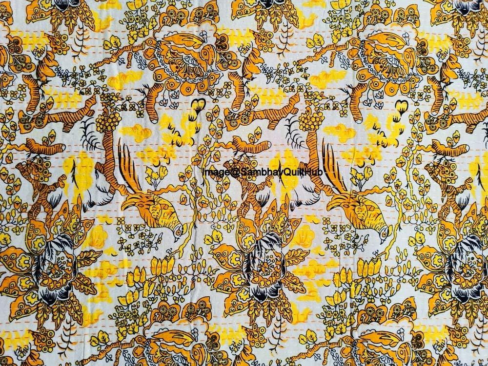 Made with 100% cotton and natural vegetable colors. This piece is of art is completely hand stitched by Women artisan in Rajasthan, India. It can make any room alive with its vivid colors, stunning Bird Floral print and embroidery, made using traditional and famous kantha hand embroidery method. Made from two thin layer of cotton fabric make this piece of art irresistible and also very comfortable. Adding to it's style, this kantha quilt is reversible and both sides can be used. Kantha is still the most popular form of embroidery practiced by rural women.typically use old saris and cloth and layer them with kantha stitch to make a light blanket, throw or bedspread. These cotton lightweight "Quilts" with a beautiful and colorful Paisley design can be used as 1. Bedspread , Bedding Throw , Blanket Or Quilt 2. A Summer Bed Cover 3. A Throw 4. A Fabulous Picnic Rug 5. Nice Bedroom Quilt , This can fit to a 90 x 108/60*90/108X108 inch's wide King/Twin size bed as blanket or throw or can easily fit as bedspread / bed cover to King/Twin bed .Size Twin (60X90), Queen Size (90X108 inch), King Size (108X108) inch