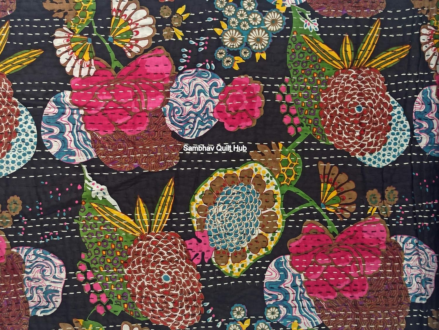 Made with 100% cotton and natural vegetable colors. This piece of art is completely hand stitched by Women artisan in Rajasthan, India. It can make any room alive with its vivid colors, stunning print,made using traditional and famous kantha hand method. Made from two thin layer of cotton fabric make this piece of art irresistible and also very comfortable. Adding to its style, this kantha quilt is reversible and both sides can be used. Kantha is still the most popular form of embroidery practiced by rural women. Typically use old saris and cloth and layer them with kantha stitch to make a light blanket, throw or bedspread. This cotton lightweight "Quilts" with a beautiful and colorful Floral design can be used as: 1. Bedspread, Bedding Throw, Blanket or Quilt 2. A Summer Bed Cover. 3. A Fabulous Picnic Rug 4. Nice Bedroom Quilt. Size Twin (60X90), Queen Size (90X108 inch), King Size (108X108) inch pillow size 20X26 inches Kantha floral With Pillow Cover