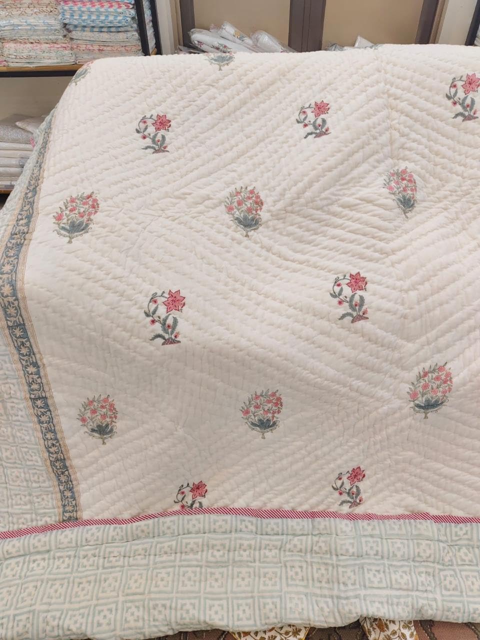 Transform your bedroom with this exquisite handcrafted cotton quilt from Jaipur. The stunning combination of white and mint green geometric patterns creates a sophisticated look, while delicate floral block prints add a touch of traditional charm. The quilt features beautiful pink floral motifs scattered throughout, complemented by a charming red striped trim that adds a playful accent. Perfect for a queen-sized bed at 90 x 108 inches, this lightweight bedspread offers comfortable warmth without being too heavy. The intricate quilting technique ensures durability while creating a luxurious texture that enhances your bedroom's aesthetic. The versatile design works well with both modern and traditional decor schemes. This handcrafted bedspread serves as both a functional comforter and a decorative piece, making it ideal for year-round use. Ideal as a bedspread, throw, comforter or travel blanket. The cotton construction provides breathability and comfort, while the detailed craftsmanship showcases the rich textile heritage of Jaipur. The quilt's generous dimensions allow for ample draping on a queen-sized bed, creating an elegant, polished look for your bedroom. No two quilts are exactly alike.