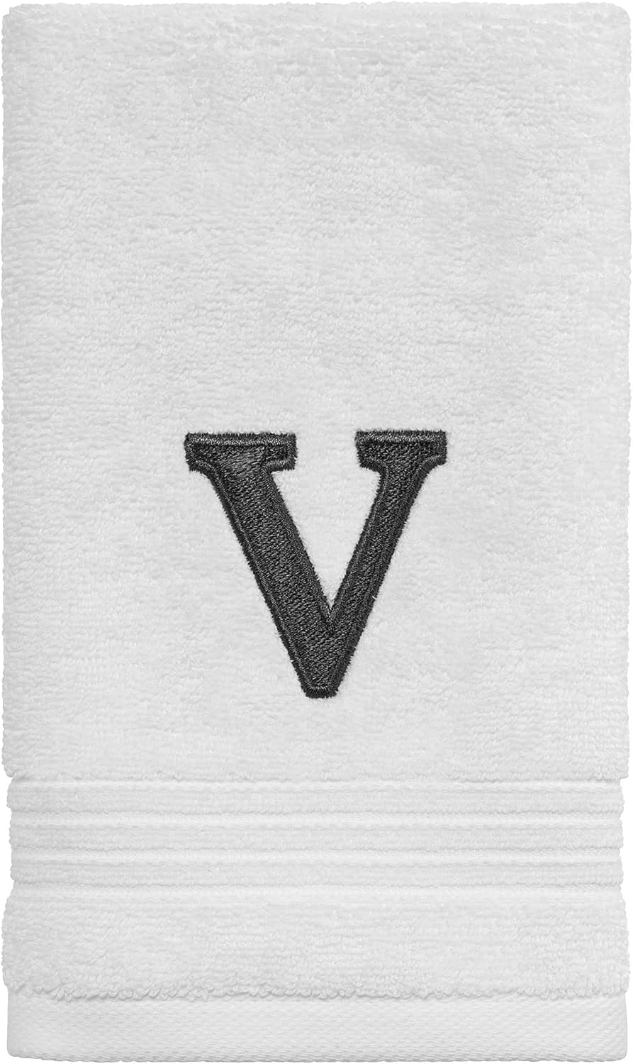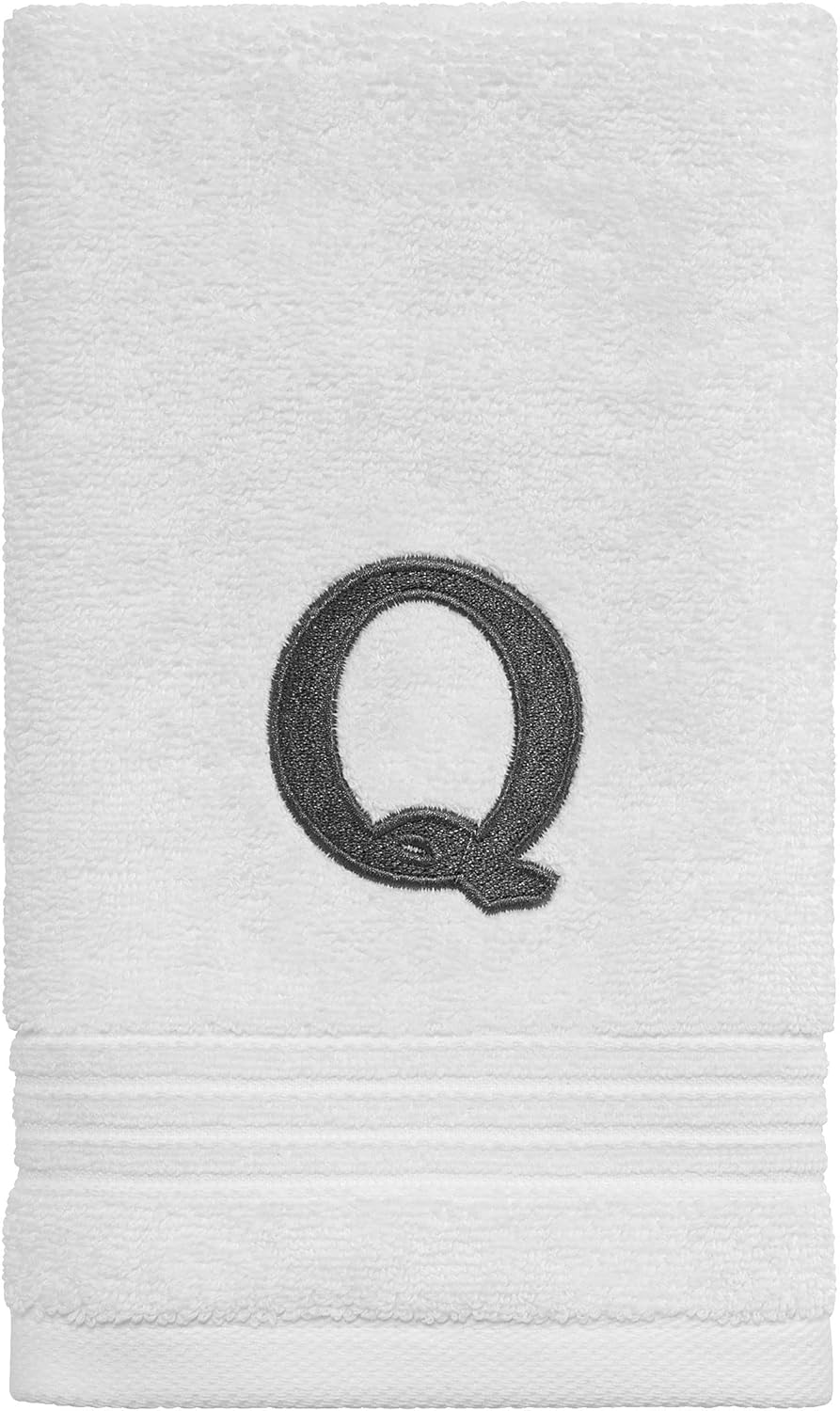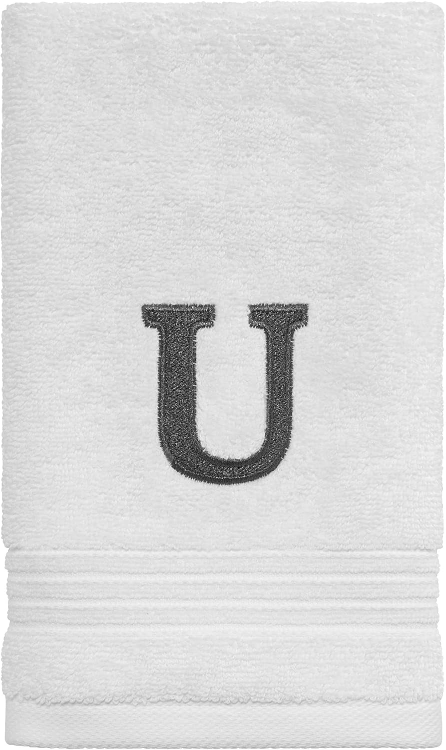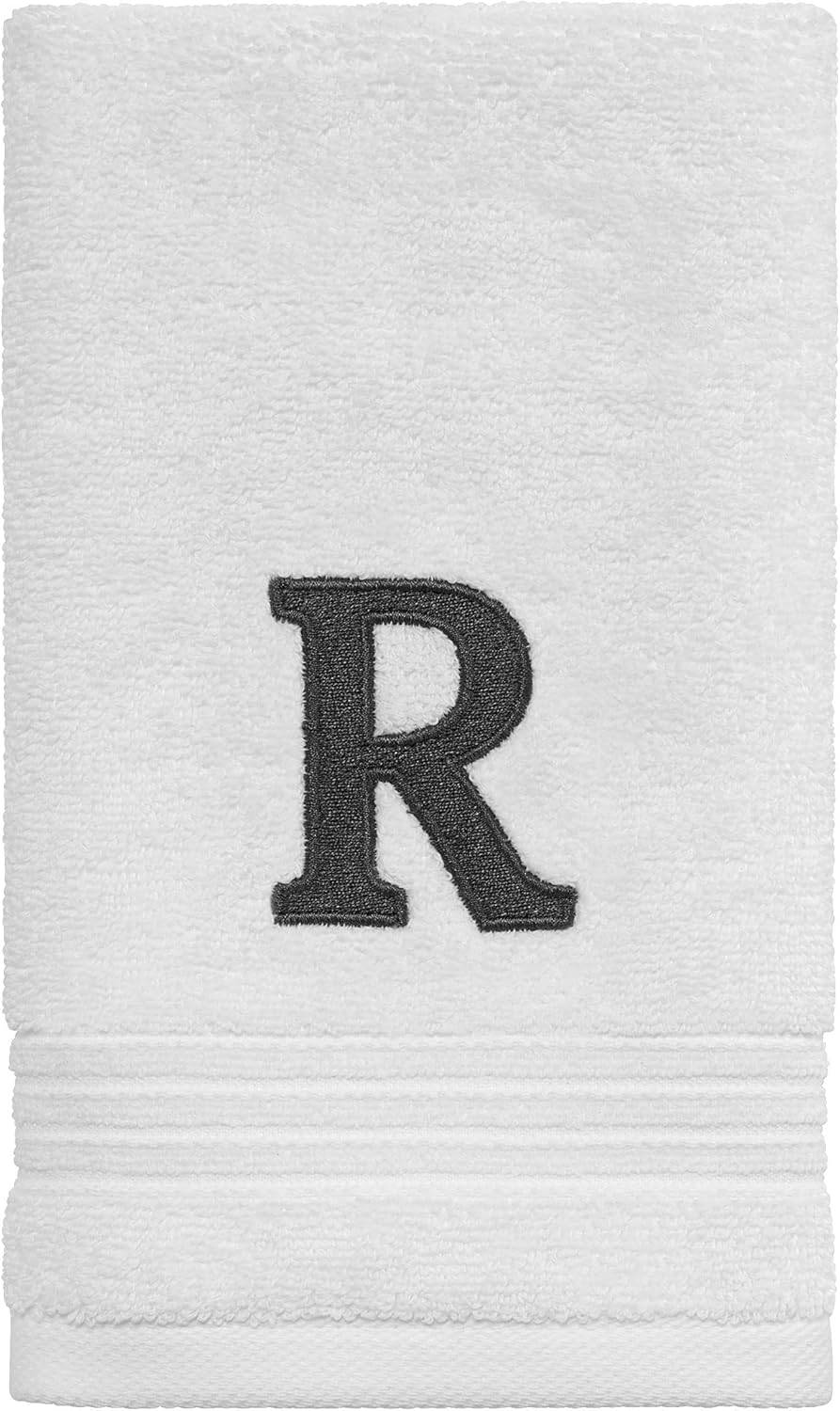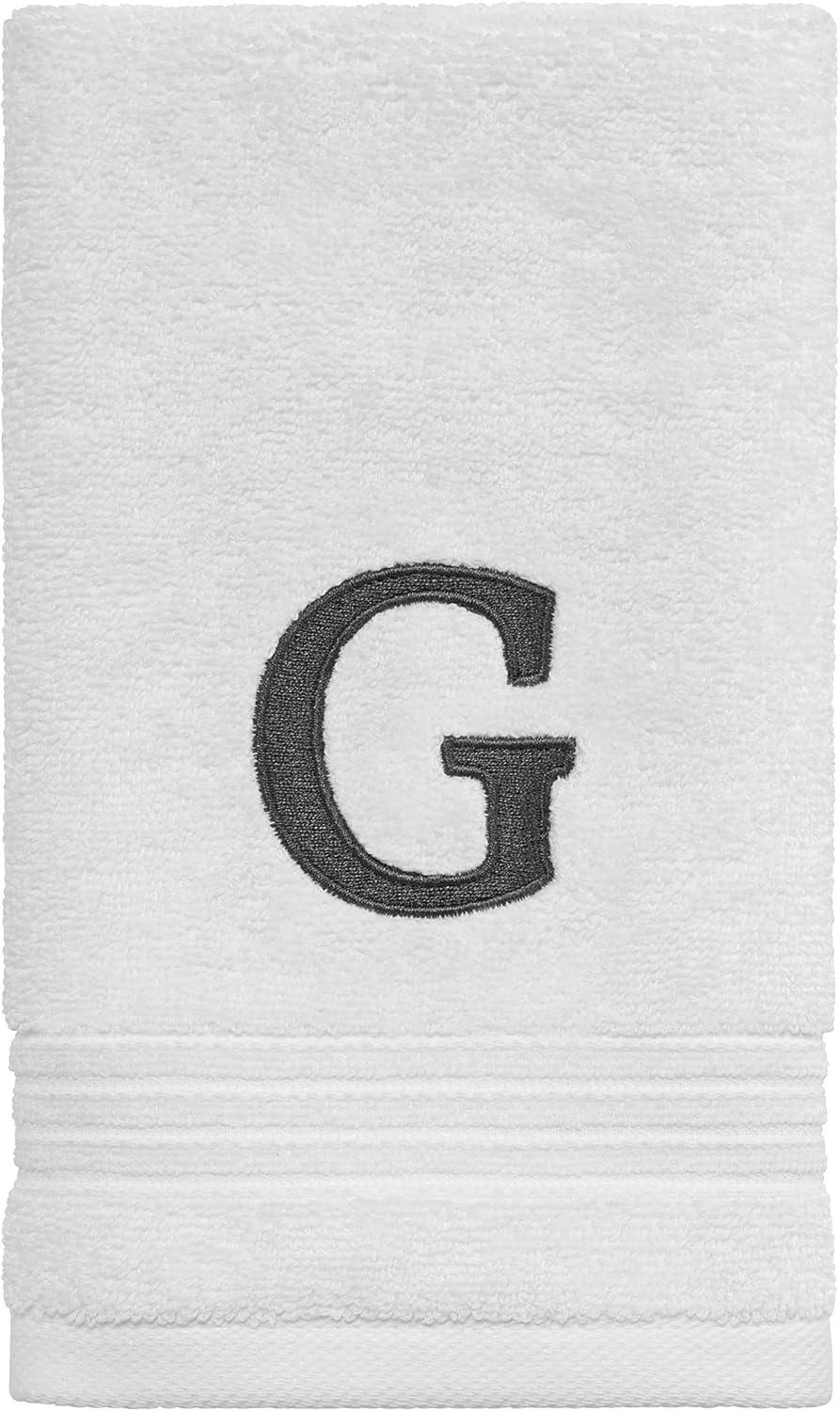 The Avanti Monogram Fingertip Towel features a grey embroidered letter on a brilliant white 100% cotton towel with ringspun combed loops and a contemporary decorative ribbed border. The towel measures 11” x 18”. Matching bath and hand towels also available. Choose from all 26 letters.