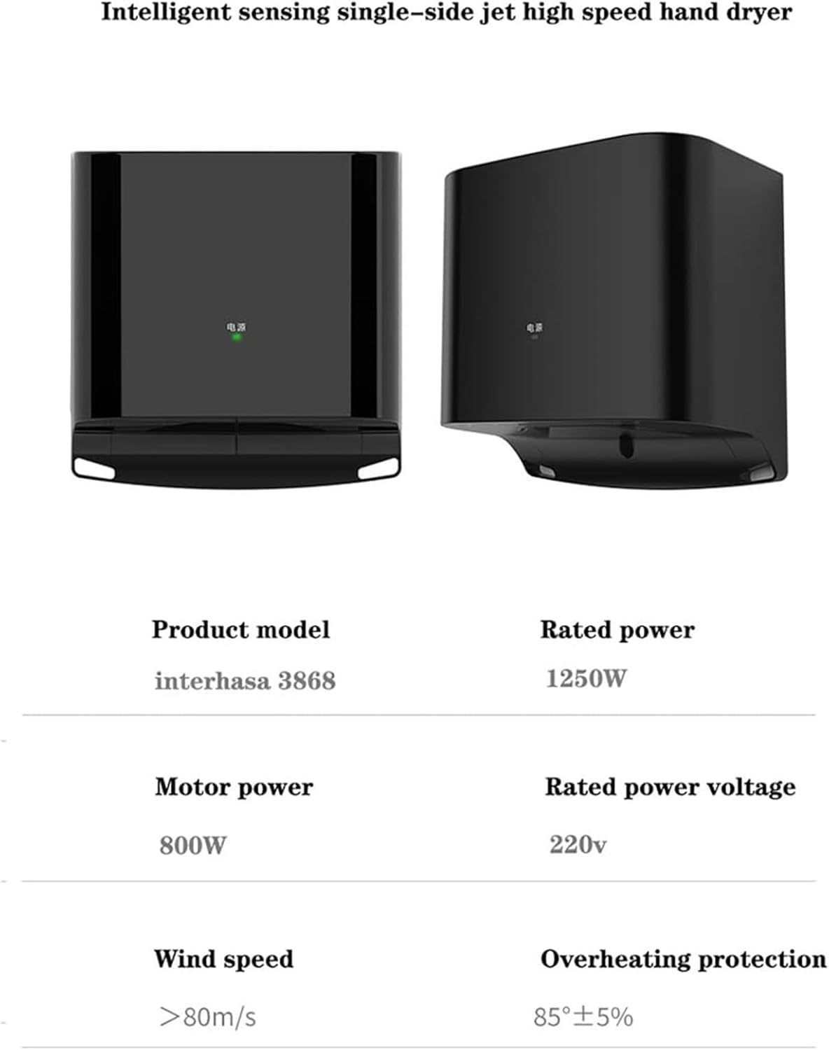 ✫This mini hand dryer can detect your hands when they are within the induction range and then starts blowing air. It is easy to install and convenient to use. Its small volume makes it suitable for commercial entities, shopping centers, restaurants, clubs, domestic use, etc.✫Features:1.Drying time: about 8-10 seconds.2.Powerful motor with carbon brushes.3.Extremely hygienic and easy to maintain hand dryer.4.Contactless with infrared sensor ✫Specifications:Product name: hand dryerMaterial: ABSRated power: 1250 WMotor power: 800 WRated voltage: 110V/220VWind speed: >80 m/sWaterproof grade: IPX4Size: 245*155*250mmWeight: 3.4 kg✫Package includes:1 x hand dryer✫Note:1. Please allow slight error due to manual measurement.2. If you are not satisfied with the product, please contact us, we will serve you wholeheartedly.