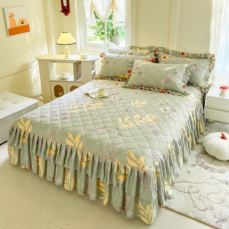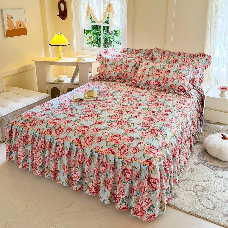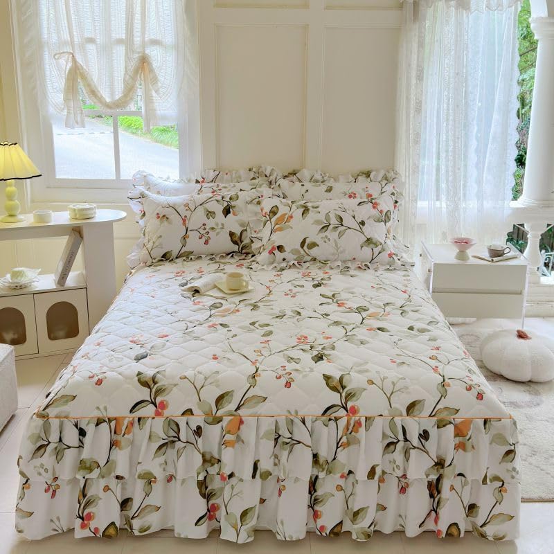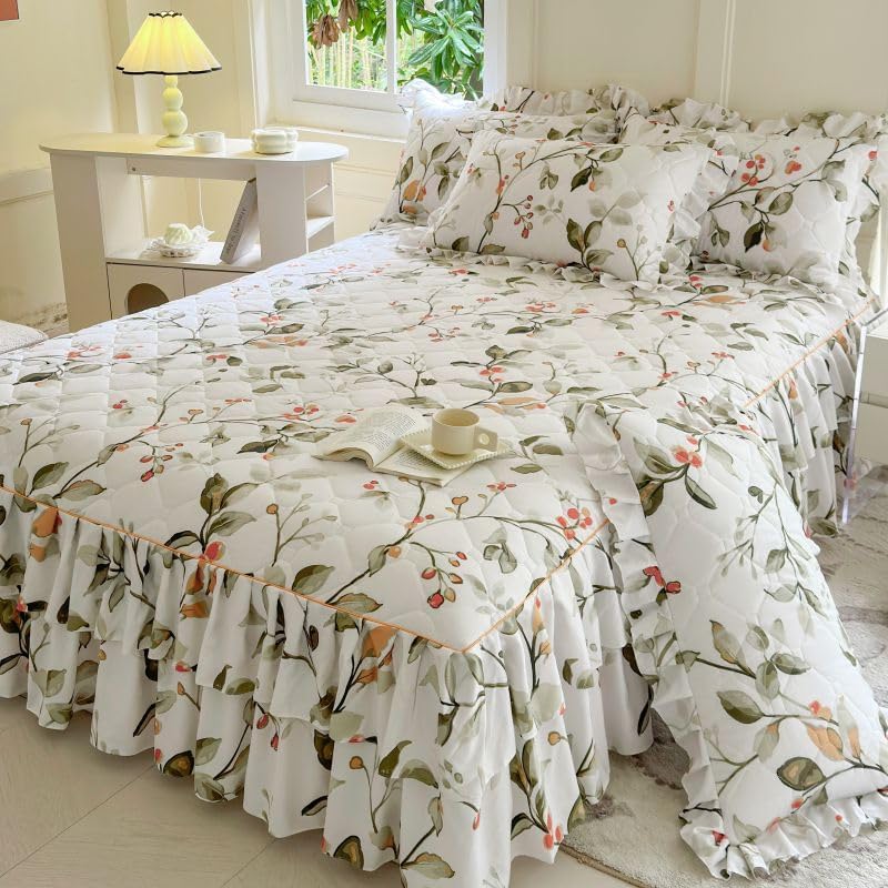 This type of uniquely designed bedspread with the 3 sides long enough to act as the bed skirt which is an fantastic piece for your room decor. Warm quilted design on the top, super craftsmanship, coverage, pleating and comfort are automatically achieved with this product. So easy to make the bed with this spread. Just pull up the top of the spread and the bed is made up. Throw pillows complete the look of any type of theme. You will love your bed and have a sound sleep every night.Size Information:Twin Size: 1 x bedspread sheet with 47" wide x 78" long (120 x 200 cm), ruffle length 15" (35 cm), 2 x pillowcases with 19" wide x 29" long (48 x 74 cm)Queen Size: 1 x bedspread sheet with 59" wide x 78" long (150 x 200 cm), ruffle length 15" (35 cm), 2 x pillowcases with 19" wide x 29" long (48 x 74 cm)California King Size: 1 x bedspread sheet with 70" wide x 78" long (180 x 200 cm), ruffle length 15" (35 cm), 2 x pillowcases with 19" wide x 29" long (48 x 74 cm)King Size: 1 x bedspread sheet with 78" wide x 86" long (200 x 220 cm), ruffle length 15" (35 cm), 2 x pillowcases with 19" wide x 29" long (48 x 74 cm)How to choose the Size?Step 1: Measure the width of your bed and height from mattress top to floor, calcuate the expected total width of bedspread = bed width + 2 x bed height.Step 2: Refer to the total width of our bedspreads below:The total width of Twin Size is 75" (190 cm).The total width of Queen Size is 86" (220 cm).The total width of King Size is 106" (270 cm).The total width of California King Size is 98" (250 cm).Step 3: Choose the suitable size of our bedspread. Please Note: if you have a high bed, please choose a large size to make the bedspread drape to the floor.