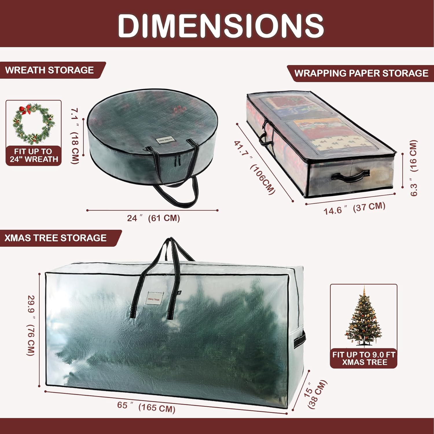 Keep your holiday decorations organized and protected year-round with our exclusive bundle! This set includes two 24" clear wreath bags, a spacious 9 ft Christmas tree storage bag, and a convenient gift wrapping paper storage solution. Each item is crafted from durable, clear material for easy identification and access. Perfect for maintaining the pristine condition of your festive gear!