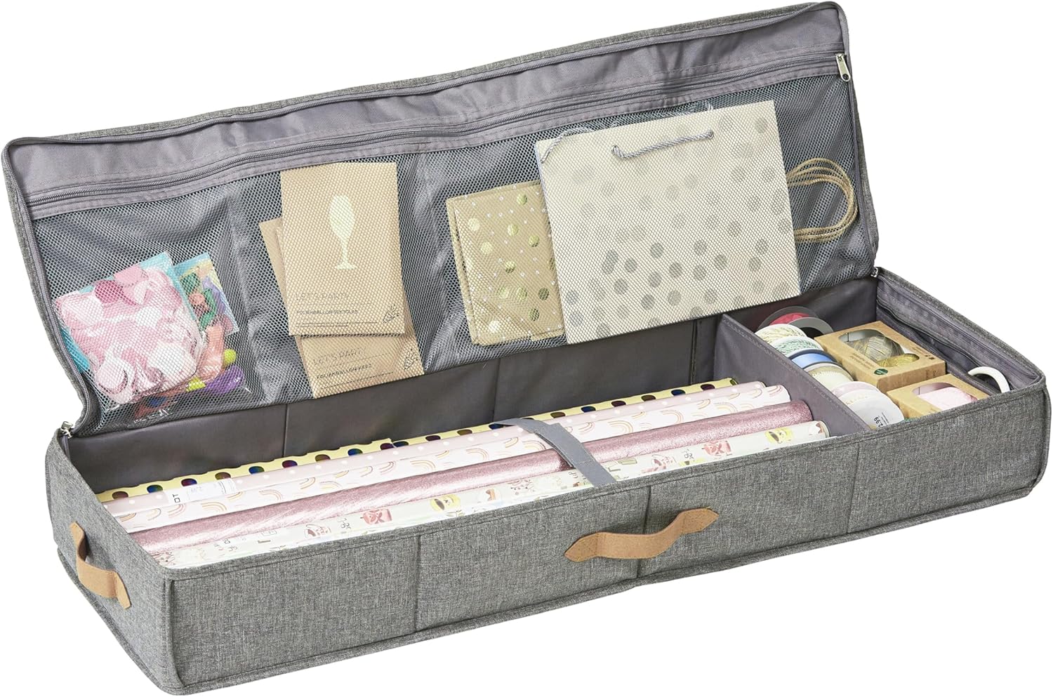 Organizer for storing wrapping paper The practical storage bag finally combines everything about wrapping gifts in one place: there is space for wrapping paper rolls, ribbons, bows, bags, as well as tape and scissors. In the large compartment you can store paper rolls with a length of 50 cm, 70 cm or 90 cm, with a Velcro fastener an additional divider can be provided. In the lid there are additional compartments for accessories, thanks to the mesh you can see the contents at any time. Thanks to the handles on three sides, the wrapping paper organiser can be carried comfortably and also hung up. Whether you want to keep your paper rolls standing, lying under the bed or hanging in the cupboard, the versatile organiser offers all of this.