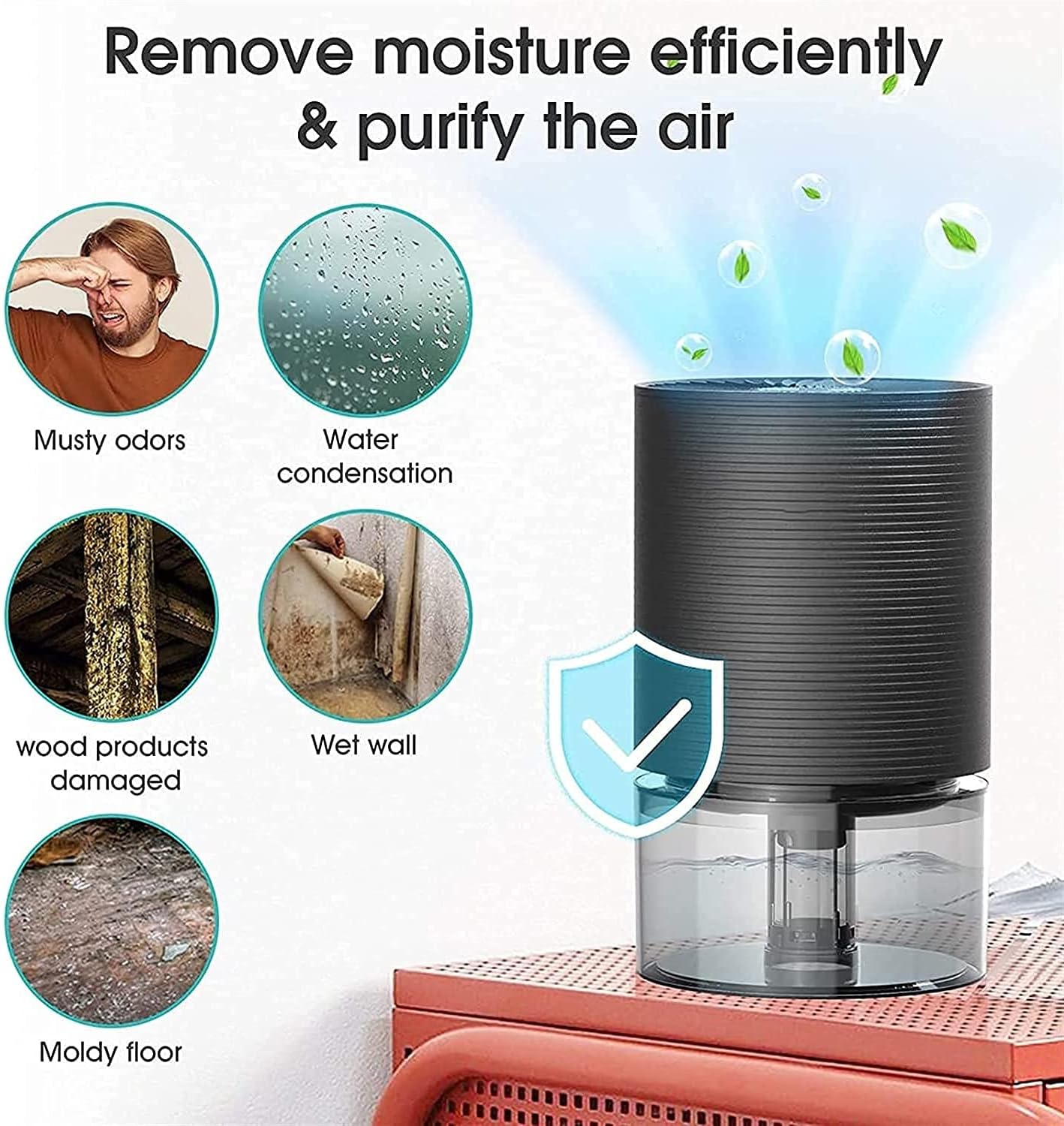 Description: The dehumidifier helps you improve air quality and create a comfortable and clean living environment for you. It is perfect for high humidity in your home, basement, bathroom, bedroom, closet, kitchen, garage, RV, living room, wardrobe, and office. No more humid and moldy annoyance. Product Specifications: Recommended room area: 5-10㎡ Size: 13x13x21.3Cm Weight: 0.75KG The length of power cord: 130cm Water tank: 750ml Tips: The best humidity is 50%. If they are too high or too low, you will feel uncomfortable. If the temperature is below 8 ℃, the use of our dehumidifier is not recommended. At this time, the effect of dehumidification is not apparent. Please place the product at least 0.5 meters from the wall to ensure that the product works properly. Service philosophy: We are confident to provide you with quality products, please rest assured to buy,if you have any questions, please feel free to contact us