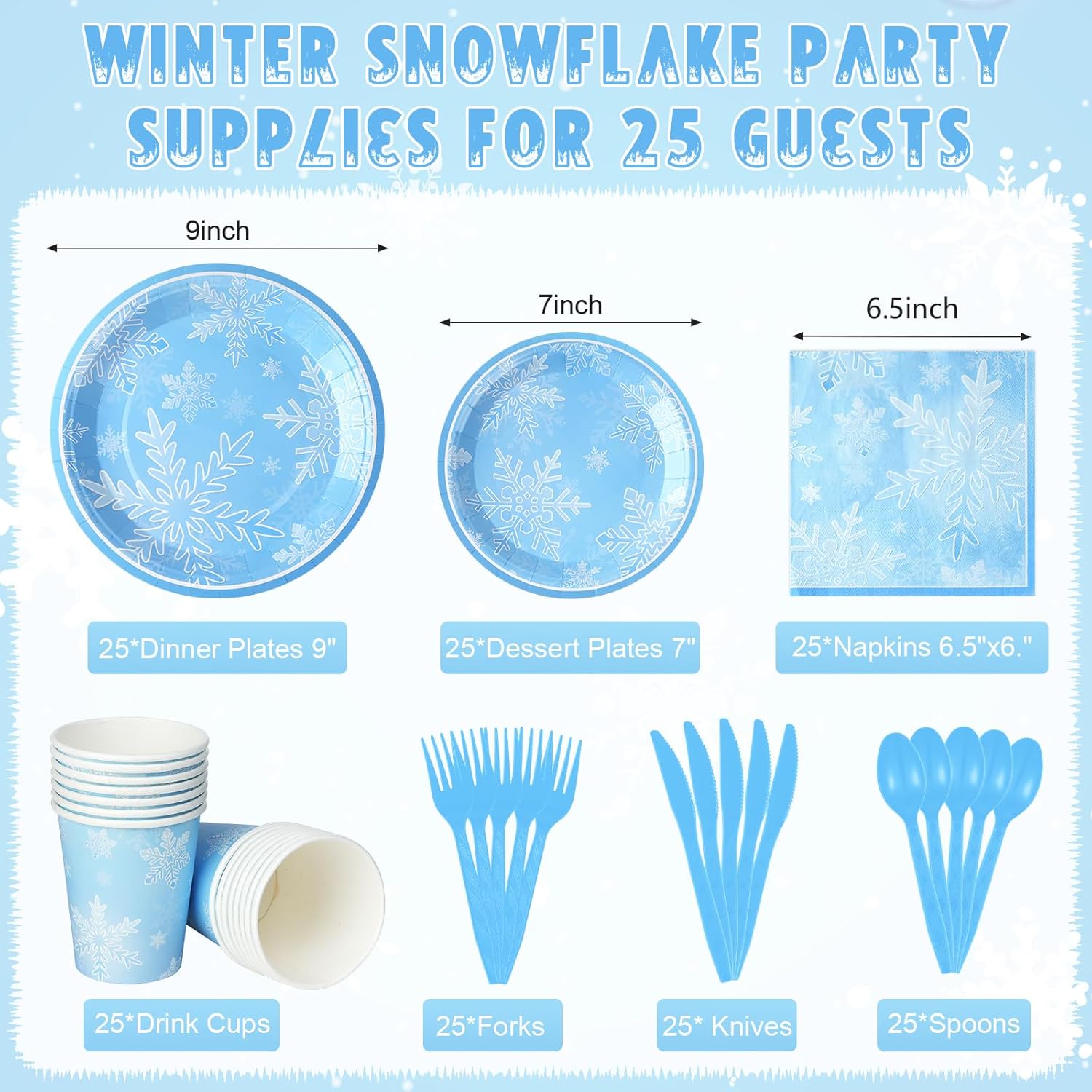 Features: Snowflake Winter Wonderland Disposable Tableware Set Our winter wonderland disposable tableware features a blue color adorned with various snowflakes in different shapes to create a sense of depth. This beautiful combination is perfect for winter gatherings and parties, adding a touch of sophistication to your event. Wide Applications: These winter snowflake tableware sets are perfectly suited for a range of events, including winter gatherings, birthday celebrations, winter wonderland parties, and other Christmas themed parties. Their presence will undoubtedly contribute to the creation of lasting and cherished memories for you, your friends, and your family. Notes: Manual measurement, please allow slight errors in size. The color may exist a slight difference due to different screen displays. Please stay away from fire. NOTE: It's not microwavable.