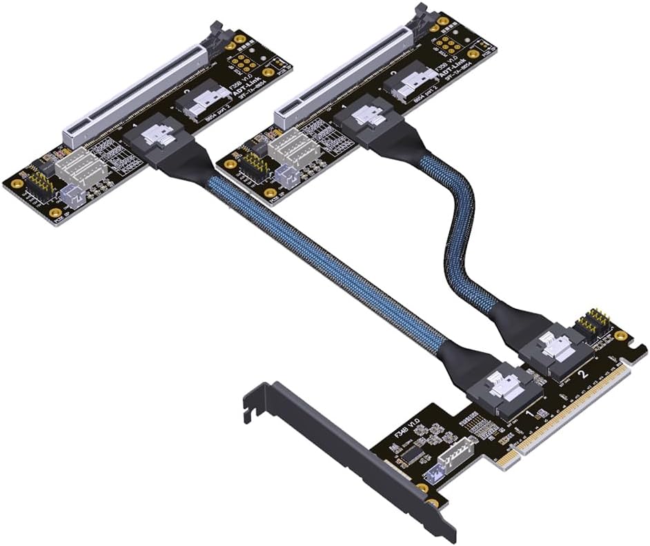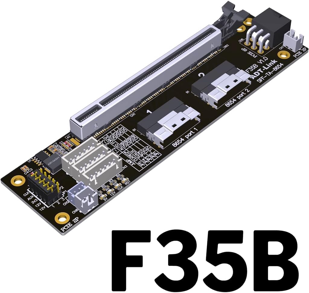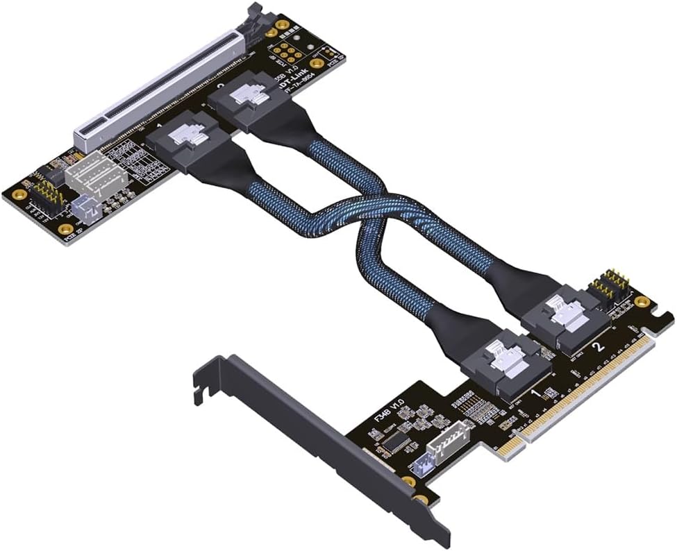 JMT ADT-F34B-F35B PCIE 4.0 x16 to x16 Extension Card Graphics Card Splitter Support 1 to 1/2 Motherboard Bifurcation Version Detail: F34B-F35B: PCIe 4.0 x16 to x16 Extension Cable, 1-to-1, Bandwidth PCIe 4.0 x16. F34B-F35B-D8S: PCIe 4.0 x16 to x8x8 Extension Cable, 1-to-2, Bandwidth PCIe 4.0 x8x8. Product Detail: Product Model: F3345B Series (F34B-F35B) Product Name: PCIe 4.0 x16 SlimSAS SFF-8654 Splitter Extension Cable Cable Length: 50cm, 100cm Speed Bandwidth: PCIe 4.0 x16, Gen4 256Gbps, backward compatible with Gen3 and Gen2 Friendly Reminder: Incorrect assembly or improper operation may damage your equipment. For professional engineers only. Cable Length and Pin Spacing Notes:Cable length refers to the length of the SlimSAS SFF-8654-8i cable. Accessory Notes: Includes one SATA power adapter cable. Must be connected to the white connector to have 12V power supply. Product Advantages: 1. Mesh-covered cables ensure stable speed and resistance to pulling. 2. UL-certified PCB material delivers excellent conductivity. 3. Connector housing made of PA10T/LCP with 15µ" gold-plated terminals for durable insertion/removal, meeting RoHS/Free(HF) requirements for high-frequency applications. 4. Advanced design and precision craftsmanship ensure stable signal quality, optimized routing, and effective isolation. Meets PCIe 4.0 standards for diverse applications. 5. This PCIe adapter cable supports modular splitting. Supports motherboard Bifurcation PCIe configurations for 1-to-1, 1-to-2, or 1-to-4 connections. Flexible design for broad applicability.