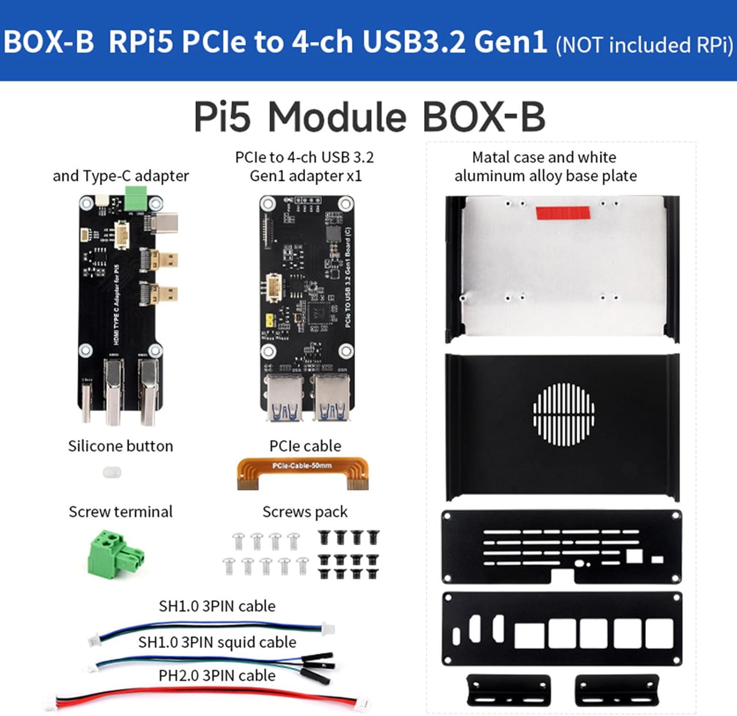 Aluminum Protective Case with PCIe USB 3.2 Gen1 Port to 4 Channel USB 3.2 Gen1 Adapter Development Board InstallationFeatures:The chassis design supports expansion to four USB 3.2 Gen1 interfaces through PCIe technology, providing extremely fast data transmission capability.It is to connection USB storage devices and cameras, which greatly enhances the flexibility and functional diversityThe interior space of the chassis is spacious, which can accommodate various expansion module, such as module and other HAT devices. This design not only improves machine, but also reserves extra space for cable management and reduces clutter.The chassis is equipped with multiple interfaces, including Type C and hdtv interfaces, and screw terminals for connecting devices are also provided. This configuration ensuring the connection between different devices, whether monitors, cameras or other external devices can be easily connection to meet the needs of various usage scenario.The chassis supports two power connection from the front or the back, providing users with great flexibility.Specifications:Component:Metal+PlasticSize:Approx.163x91x43mm/6.42x3.58x1.69inchPackage Includes:1Pc Aluminum CaseNote:1.Please allow 1-2cm errors due to manual measurement, making sure that you not mind before order. 2.Due to the differences between different monitors, the picture may not reflect the actual of the item.