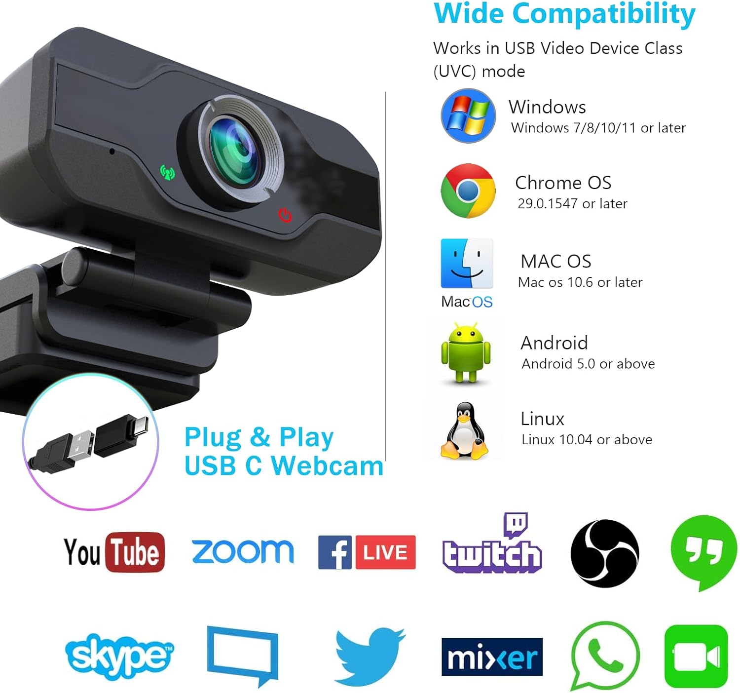 | BuiltIn Media | Privacy Cover, Tripod, USB A to C Adapter, User Manual, Webcam |