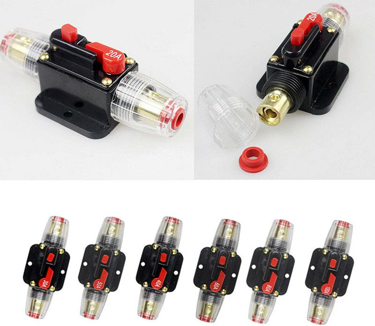 Circuit BreakersfuseAmpere range: 20A 30A 40A 50A 60A 80A 100AHigh Current Circuit BreakerVoltage: 12V-24V DCFor car, boat, marine, bike use, etc.Stops Power Surges from Damaging Your AmpsMount on Panel or FirewallUnique Push Button Reset can also be used as a Kill SwitchHigh Tech water resistant housingRUBBER BOOTS FOR WATER PROTECTIONNo More Spending Money on Replacing FusesReplaces the AGU Style FuseholderFeatures:* Brand new, made with high quality parts.* Works with 12v - 24v DC* 4/8 awg input &output 4mm in diameter* Easy to use and durable.* Function: prevent excessive current, protect the electrical appliance.* Apply in connecting audio power line.* Use in place of an inline fuse holder.* Suitable for car audio/video system overload protection* Manual open circuit push button.* Self-Testing &Manual Override Easy to operate with manual reset arm .* No fuse change trouble.* Can be mounted on panel or firewall* 12 Volt - 20Amp 30Amp 40Amp 50Amp 60Amp 80AMP 100AMP* Size: 98mm (L) x 43mm (W) x 35mm (H)Package included:1x 12V-24V DC Auto Audio Circuit Breaker Reset Fuseholder