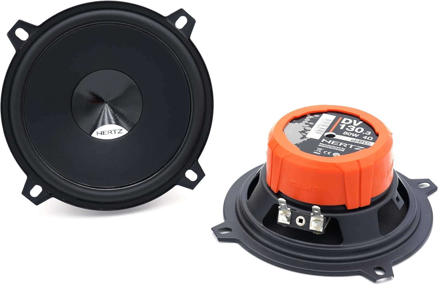 Dieci car audio systems let you realize a high quality audio system with the utmost in simplicity. The woofers employ the exclusive V-cone profile for amazing off-axis response and detailed mid-high range. The TPU (Thermoplastic polyurethane) surround ensures linearity and reduction of unwanted resonance, even at high excursion. High-performance materials, such as the neodymium motor assembly and the PEI membrane, ensure an extended high frequency range. The passive filters are found directly on the supplied connection cables, along with a rich array of accessories increasing the install-friendliness and installation time. Features - 24 mm PEI dome-cone tweeter. High efficiency annular acoustic lens. Large motor assembly for mobile voice coil control. Pure copper voice coil, wound on conex former, for maximum lightness. V-cone for best off-axis response, clear mid-high frequency detail and powerful bass. TPU surround, for wide excursion and resonance damping. DIN size basket protected by abrasion-proof dust paint. Specifications - Power Handling - Peak W: 120 Power Handling - Continuous W: 60 Impedance Ω: 4 Frequency response Hz: 60 ÷ 23k Sensitivity dB SPL: 93 Voice coil Ø mm (in.): 25 (1.0) Woofer size mm (in.): 130 (5.0) Tweeter size mm (in.): 24 (0.9)