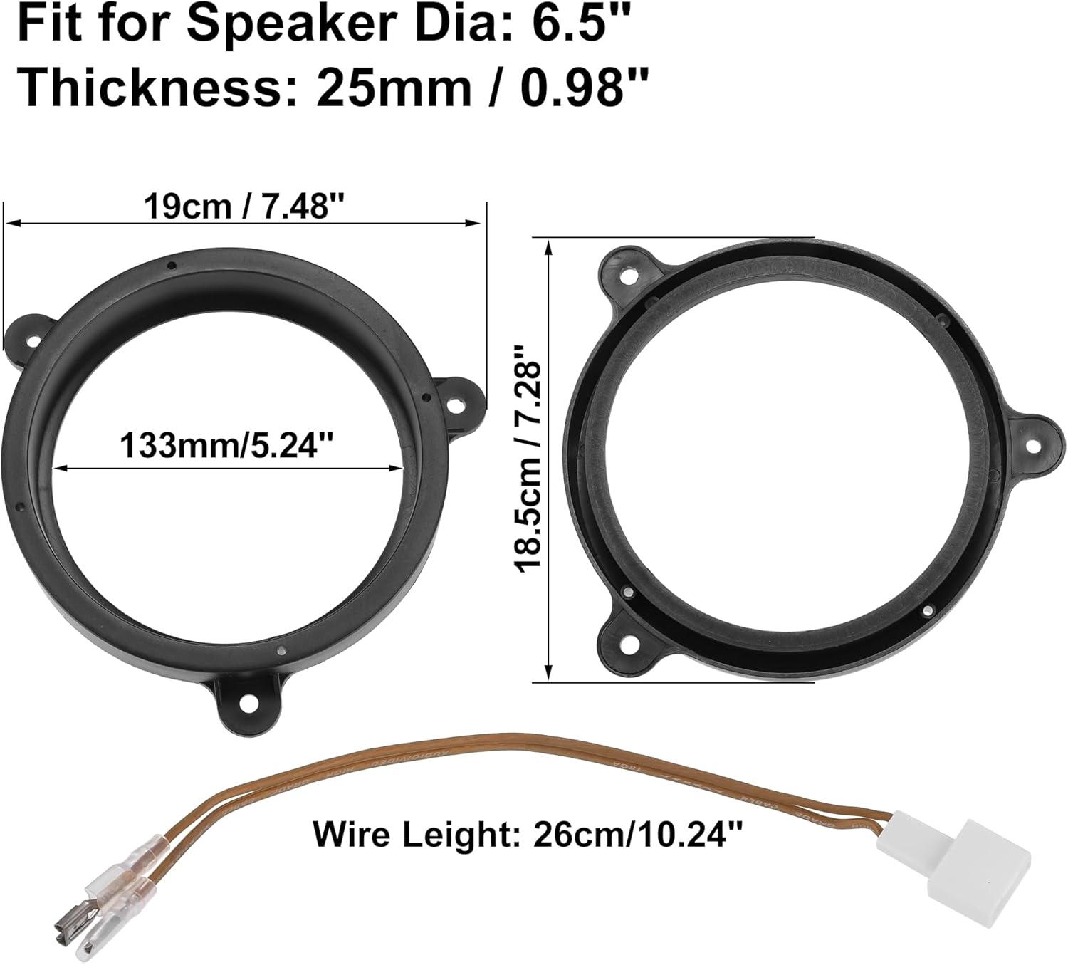Description:Can be used to protect the the speaker from rain and prolong its service life.Universal product fits most speakers on the market and can be used in Cars, Boats, Trucks, RVs, and more.These car speaker spacers are made of soft plastic material, easy to install.Improvement in sound quality.Good Quality: Made of good quality materials to improve reliability and durability.The spacer fits a 6.5" speaker.This is a non-OEM product, accessory only!Specifications:Condition: Brand NewMaterial: PlasticColor: BlackFit for Speaker Dia: 6.5"Thickness: 25mm / 0.98"Inner Diameter: 133mm/5.24"Size: 19x18.5x2.5cm / 7.48"x7.28"x0.98"(L*W*T)Wire Lenght: 26cm/10.24"Number of Pins: 2Fitment:for Subaru Forester 1998-2020 rear doorfor Subaru Impreza 2007-2019for Subaru Legacy 2003-2014for Subaru XV Crosstrek 2012-2015for Subaru Outback 2009-2018for Subaru WRX 2014-2020Note:Please make sure this part fits your vehicle before orderingPlease allow a 1-2mm error due to manual measurement.Package Include:2 Set x Car Speaker Spacer Rings with Wires