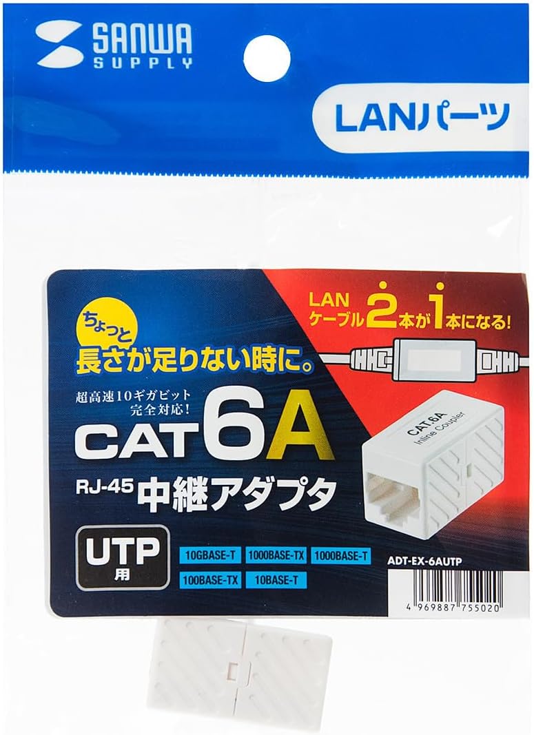 Relay adapter (coupler) for RJ-45 connectors that support category 6A compatible with 10 Gigabit Ethernet. Compliant with 10 GBASE-T standards for 10 GB transmission speed and 500 MHz transmission bands. Can be used to interconnect UTP LAN cables. ■Color: White ■Category: CAT6A ■ Standard Name: 10GBASE-T ■Supported transmission bands: Category 6A (10GBASE-T), Category 6 (1000BASE-TX), Category 5 (1000BASE-T), Category 5 (100BASE-TX), Category 3 (10BASE-T) compliant ■ Size: W15 x D30.1 x H16.9 mm ■Weight: 4.4g ■ Connector Shape: RJ-45 Female ■Wiring specifications: straight wire