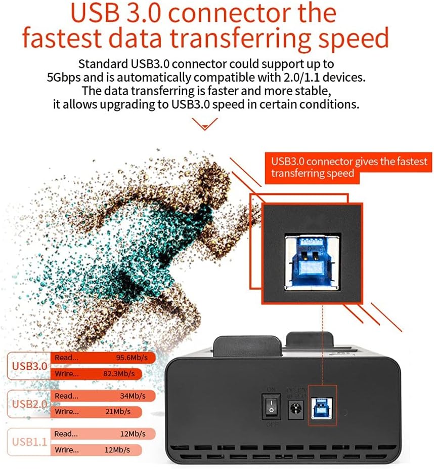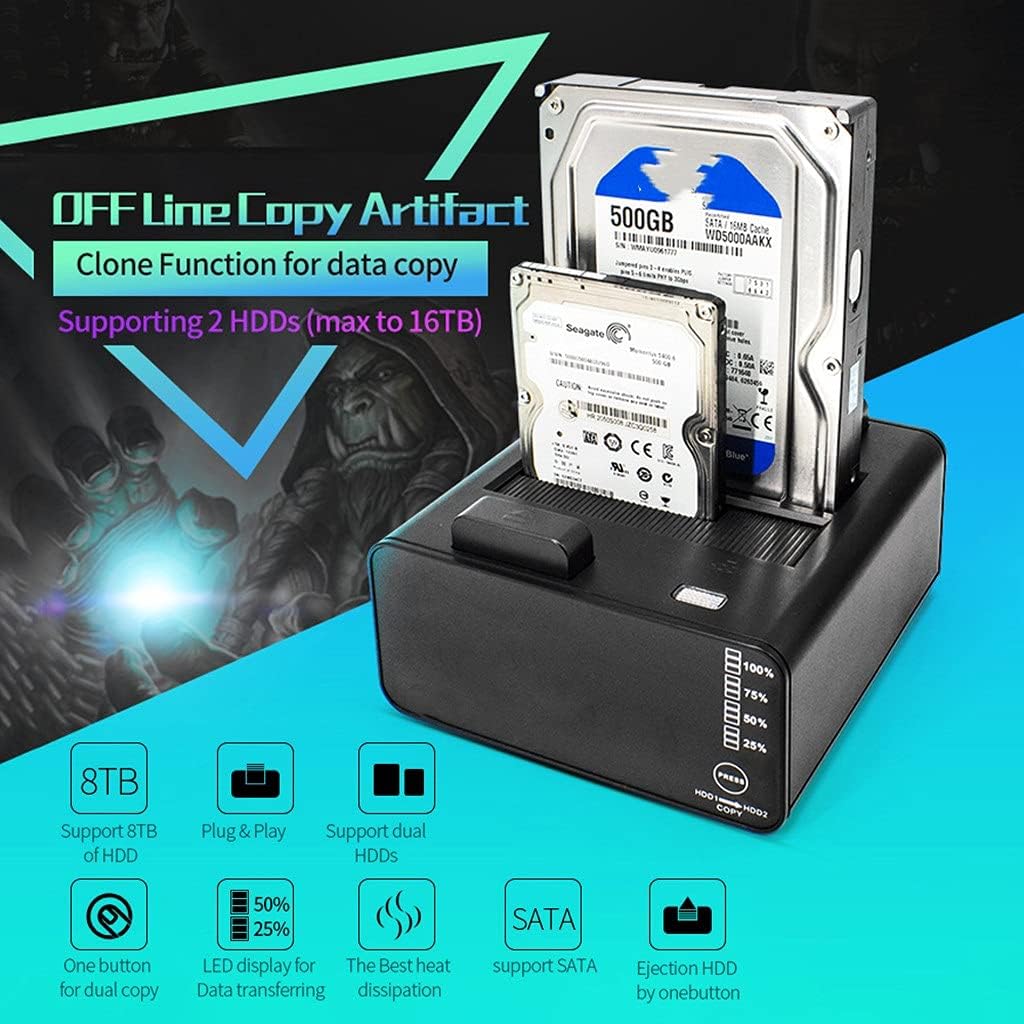 It supports 2 different sizes of SATA hard disk to work simultaneously. Plug and play. Support /Linux/XP/OS/Mac and also could be used in router, smart TV and high resolution entertainment device. Standard USB3.0 connector could support up to 5gbps and is automatically compatible with 2.0/1.1 devices. The data transferring speed is faster and stable. Innovative design of button copy and show copy progress with LED display. No need to connect computer to do clone function. Automatically copy data from disk to another disk. Adopt button ejection design that enable users to press the ejection button and take out the hard disk easily. It supports hot swap. Interface: USB3.0 data transmission: USB3.0 (5Gbps); USB2.0 (480Mbps) OS: XP/Vista/7/8/10/Mac/Linux Power: AC 100-240V; 12V Item size: 14.6 x 13.9 x 7.6 cm / 5.75 x 5.43 x 5.43 x 2.99 inches (7L x W x H) Item weight: Approx.383g / 13.51oz Package list: 1x HDD Docking Station
