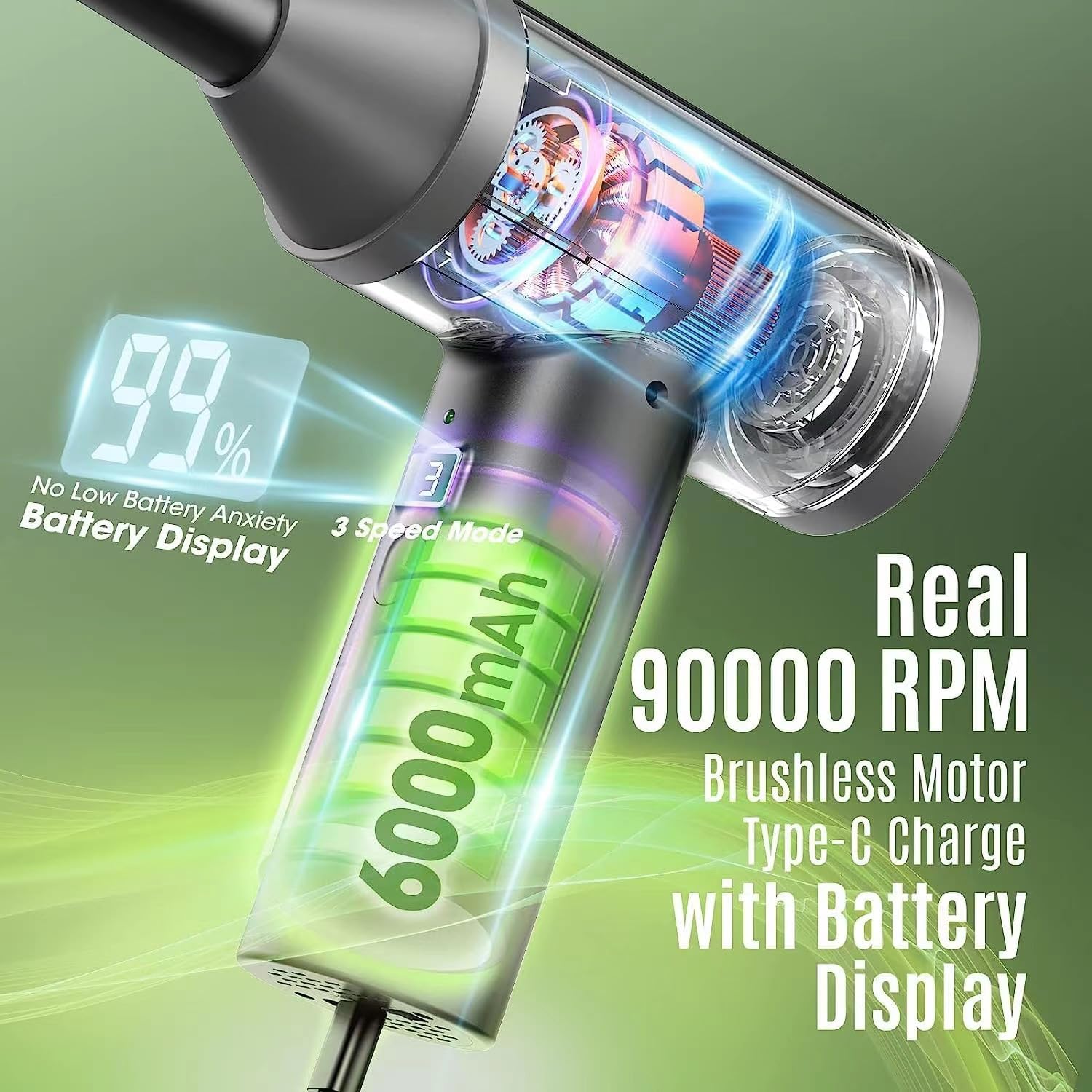 Also known as an air duster, this electric hair dryer is a combination of a hair dryer and a mini handheld vacuum cleaner that allows you to remove dust with ease. Electric dust collectors can be used for different purposes, taking the hassle out of cleaning. It's economical and convenient to have in your home or office. Name: Compressed air dust collector Motor type: high speed brushless Material: ABS Speed: 90000 rpm Product net weight: 740G Product size: 210*140*70mm Charging time: 3.5-4.5 hours Whether there is a built-in battery: Built-in battery Built-in battery capacity: 6000mAh Power: 90W Charging interface: TYPE-C Gear speed: three-speed adjustment Battery life: 30 minutes on first gear Second gear 22 minutes Third gear 12 minutes Suction power: 8500pa in first gear Second gear 11000pa Third gear 13500pa Package includes: 1*violent turbofan 1*kit 1*Charging cable 1*Instruction manual After-sales service guarantee: Our products have after-sales guarantee. After you receive the product, if you have any quality problems, you can contact us for consultation. We will solve it for you as soon as possible within 12 hours after receiving your message.