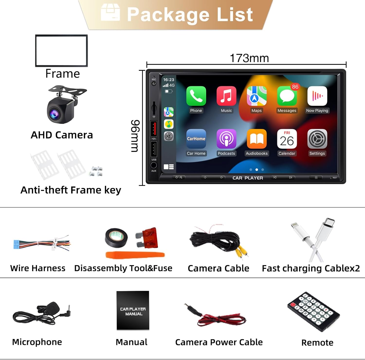 | BuiltIn Media | AHD back up camera, Fast Charging cables, Microphone, User Manual, double din car stereo |