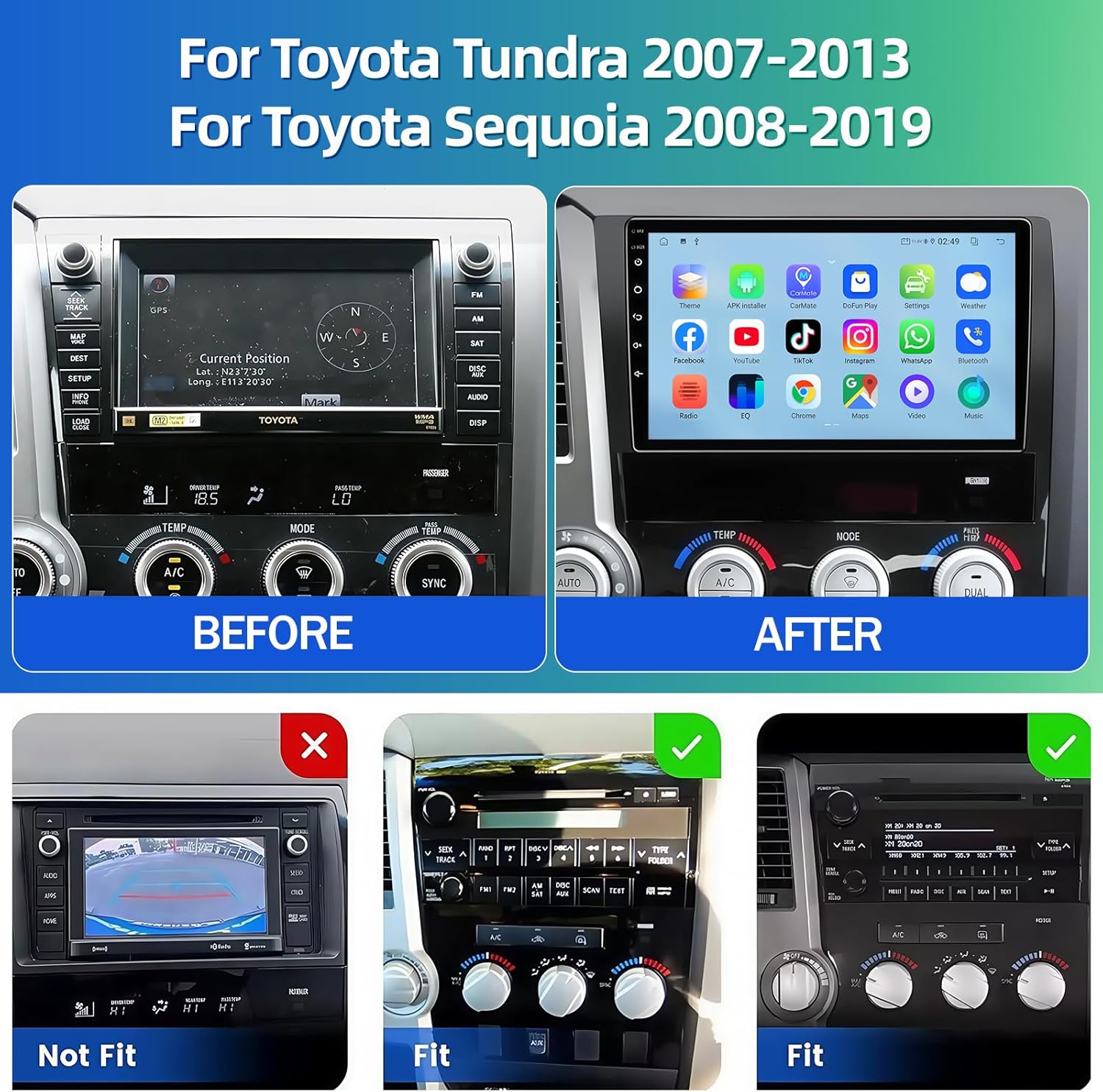 Give Your 2007-2013 Toyota Tundra, 2008-2019 Toyota Sequoia a Smart & Safe Upgrade!Tired of your outdated factory radio? Our advanced Android 13 car stereo is designed exclusively for your car, delivering a seamless fusion of cutting-edge technology and enhanced safety – all while preserving your car’s original aesthetics.🔧 CRITICAL INSTALLATION NOTE:1. 100% Verify Your Model - Check detailed 【COMPATIBILITY CHART】 in product images before purchase.2. MUST Use Professional Installer - Steering wheel control & camera wiring require expert handling. DIY errors may cause vehicle malfunction!🚀 Key Features That Transform Your Drive:Perfect Fit & Powerful PerformanceDirect Plug & Play Compatible with 2007-2013 Toyota Tundra, 2008-2019 Toyota Sequoia – no complex wiring!Quad-Core CPU + 4GB RAM + 64GB ROM: Lightning-fast response, smooth app switching, and ample storage for maps/music.Android 13 OS: Latest security, compatibility with 500,000+ apps (Spotify, Waze, YouTube, etc.).Seamless Smartphone IntegrationWired & Wireless CarPlay / Android Auto: Instantly mirror your iPhone or Android screen. Use Google Maps, make calls, play music – all via voice control (Siri/Google Assistant).Unbeatable Navigation & Connectivity Dual-Mode GPS: Online/Offline maps ensure guidance even in zero-signal areas. WiFi 6 + Bluetooth 5.4: 3X faster streaming, stable hotspot connection, crystal-clear calls with dual mics (built-in + external). Safety Redefined: 178° Ultra-Wide Backup Camera. Night Vision & Waterproof: See clearly in darkness or rain – eliminates 95% of blind spots! Retains Steering Wheel Controls: Safely adjust volume/tracks without taking hands off the wheel.Immersive 10" HD Experience1280x720 IPS Touchscreen: Vivid colors, wide viewing angles, split-screen multitasking (e.g., navigate + control music).DSP EQ Sound Tuning: Customize audio profiles for concert-like quality.📦 Package Includes:10" Android Head Unit with Frame 178° Night Vision Waterproof Camera Wiring Harness (Toyota-specific) Microphone User Manual