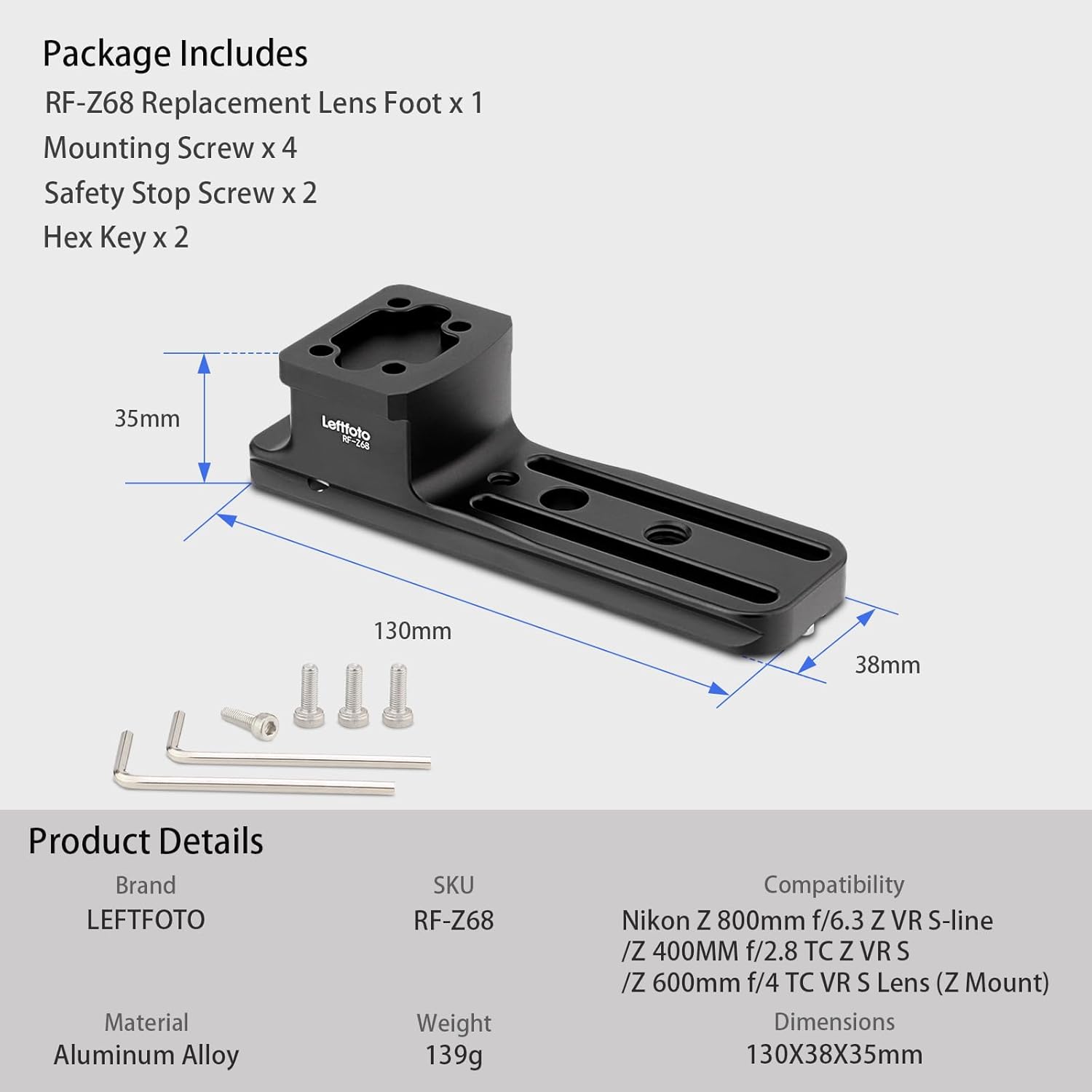About Product:The lens replacement foot is tailor-made for Nikon NIKKOR Z 800mm f/6.3 Z VR S-line /Z 400MM f/2.8 TC Z VR S/Z 600mm f/4 TC VR S Lens (Z Mount)Lenses;It features Arca-compatible dovetail which allow you attach your lens to Ball Head, Clamp or Panorama Head of Arca-Swiss standard.Two safety stop screws in both side to prevent drop by accident.Reserved 1/4" and 3/8" screw holes and QR hole at the bottom.Specifications:Brand :LEFTFOTOMaterial: Aluminum AlloyColor: Matt BlackRF-Z68:Compatible with Nikon NIKKOR Z 800mm f/6.3 Z VR S-line /Z 400MM f/2.8 TC Z VR S/Z 600mm f/4 TC VR S Lens (Z Mount) LensesPackage Contents:1x replacement foot