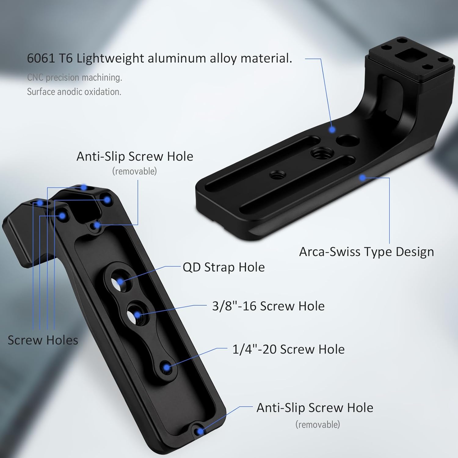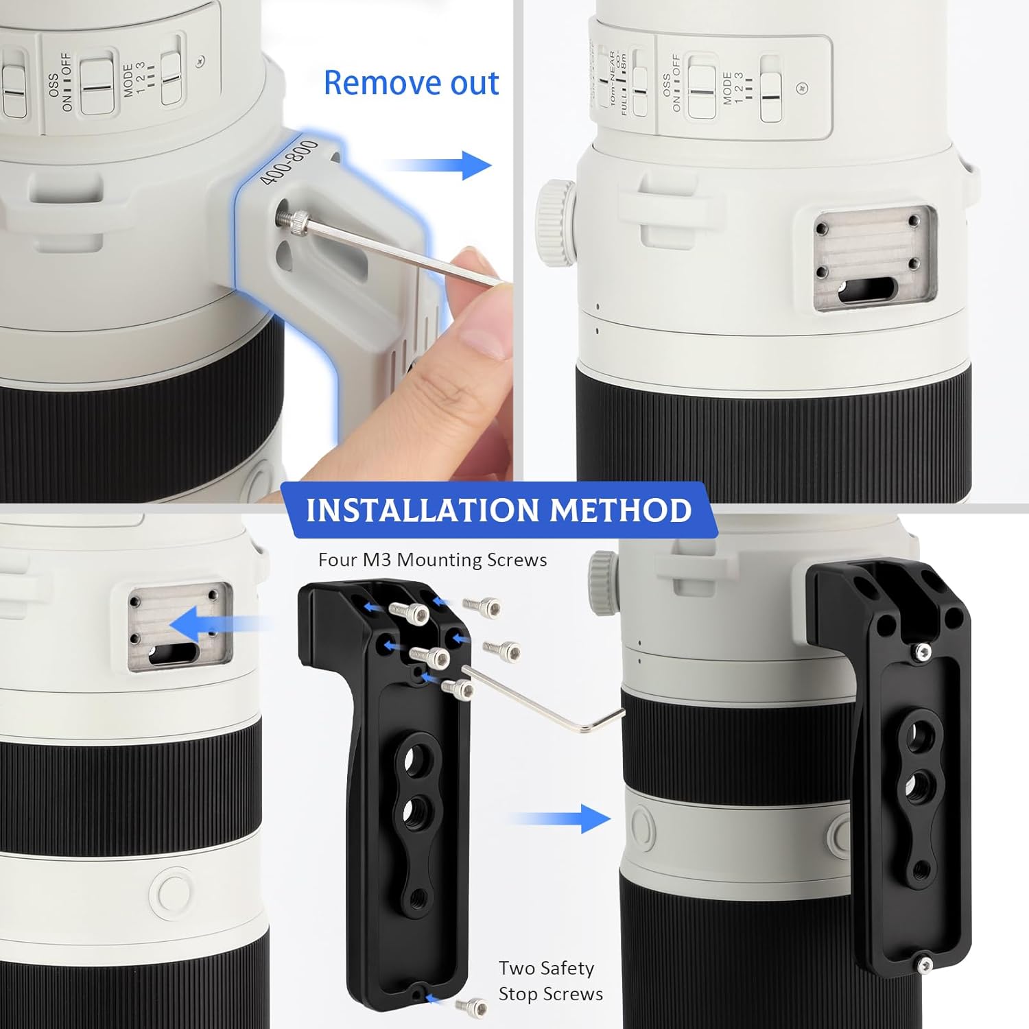 About Product:The lens replacement foot is tailor-made for Son y FE 400-800mm F6.3-8 G OSS (SEL400800G)Lenses;It features Arca-compatible dovetail which allow you attach your lens to Ball Head, Clamp or Panorama Head of Arca-Swiss standard.Two safety stop screws in both side to prevent drop by accident.Reserved 1/4" and 3/8" screw holes Specifications:Brand :LEFTFOTOMaterial: Aluminum AlloyColor: Matt BlackRF-S48:Compatible with Sony FE 400-800mm F6.3-8 G OSS (SEL400800G)) LensesPackage Contents:1x replacement foot
