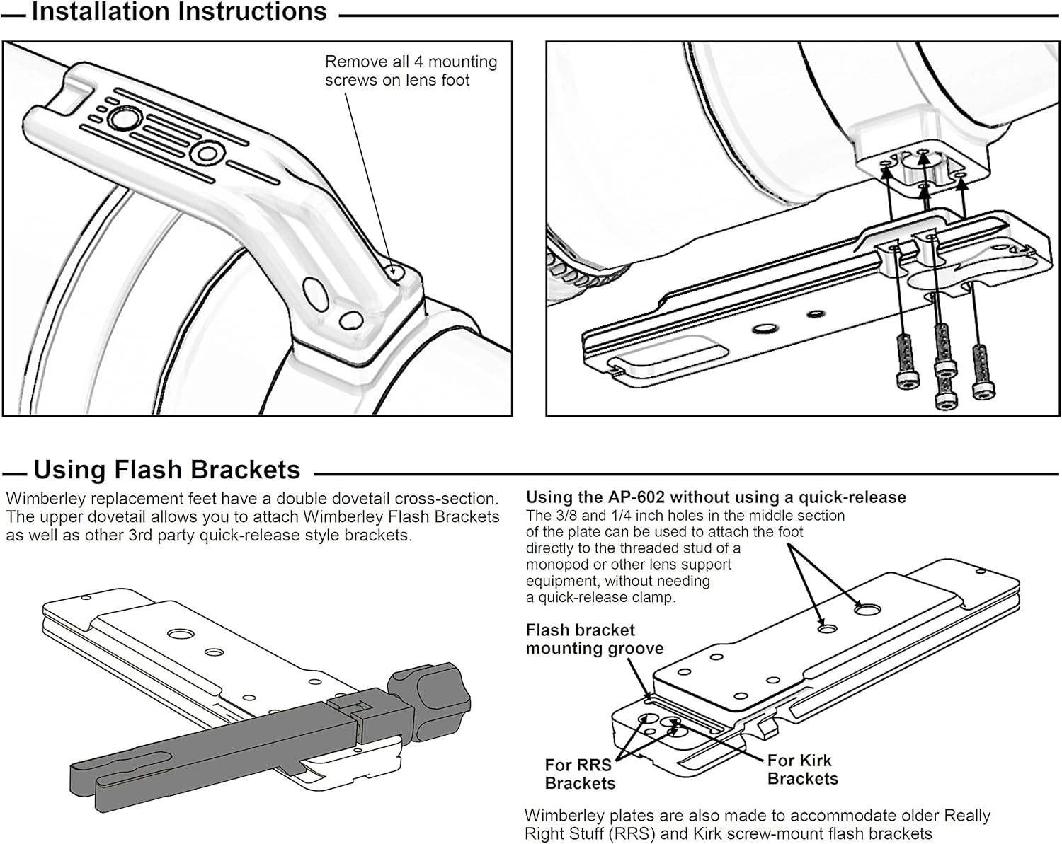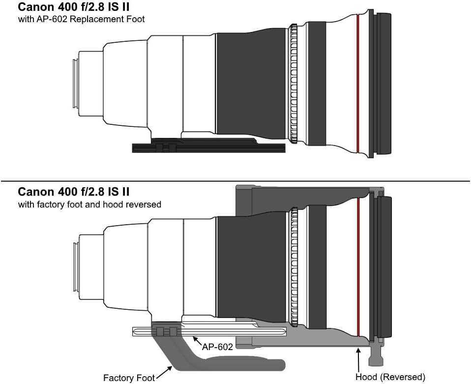 About the AP-602 Replacement Lens Foot The AP-602 replaces the stock foot on Canon Lenses (See list below, Image of compatibility chart, or our site). When installed this support lowers the overall height of the supported 400mm, 600mm, and 800mm lens by about 1.5". The AP-602 is precision machined to slide right into an Arca-Swiss style quick-release clamp. It also has 1/4" and 3/8" tapped holes for mounting to non-quick-release tripod heads and monopods. All replacement feet feature the same dual safety stops and flash bracket compatibility as our lens plates.Note: This particular plate mounts so close to the lens that it is difficult to use the plate as a handle. Also note IS version I uses the screws from the existing foot for mounting. IS version II uses included mounting screws for mounting. For use on the following Lenses Canon 400 f/2.8 IS version I and II Lenses Canon 600 f/4 IS version I and II Lenses Sigma 500 f/4 DG OS HSM Lens What's Included AP-602 Arca-Swiss Style replacement lens foot (Qty 1) Mounting Screws – M4 x 14mm Socket Head Cap Screw (Qty 4) Safety Stop Screws - M3 x 6mm Socket Head Cap Screw (Qty 2) Hex Key – 3mm T-handle (Qty 1) Hex Key – 2.5mm (Qty 1) Not compatible with most Manfrotto or Gitzo clamps